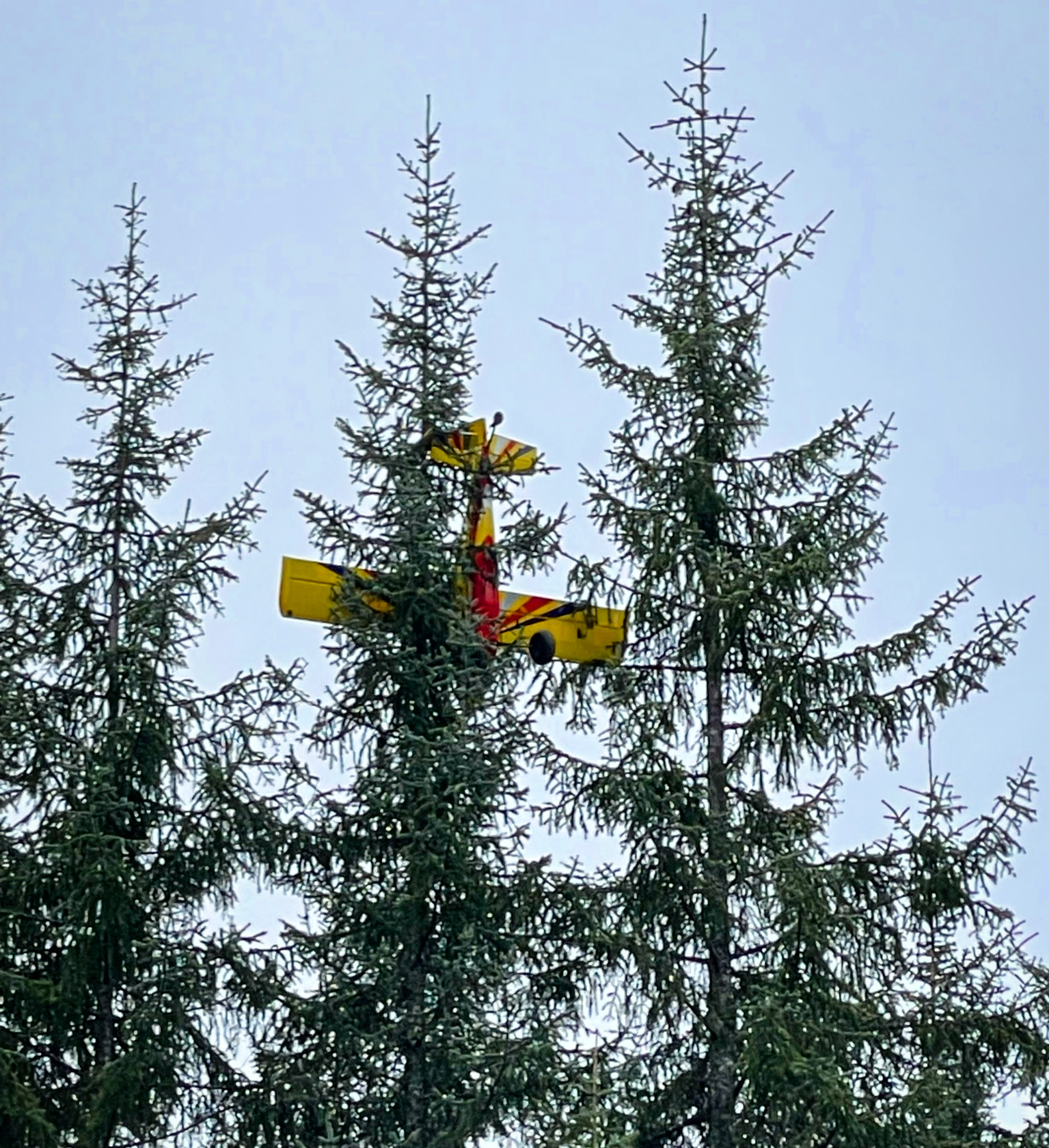 Well sometimes depth perception gets the best of us and ya know… it was my turn. I was decending from the white clouds “inside” the tree line and for one second I thought “I’m kinda close to those….SMACK” about 100ft up and hanging from a branch wedged in the elevator counterbalance gap was my beloved Timber. Stuck in a tree. I evaluated the scenario and told myself it’s time to claim defeat and call a tree service to perform an extraction. They said they were busy but knew a guy who could help if I paid him some cash ($100) and said let’s do it. I handed that guy $200 after seeing how much care he gave to my plane and how tricky it was. We were both happy as it just started to rain.