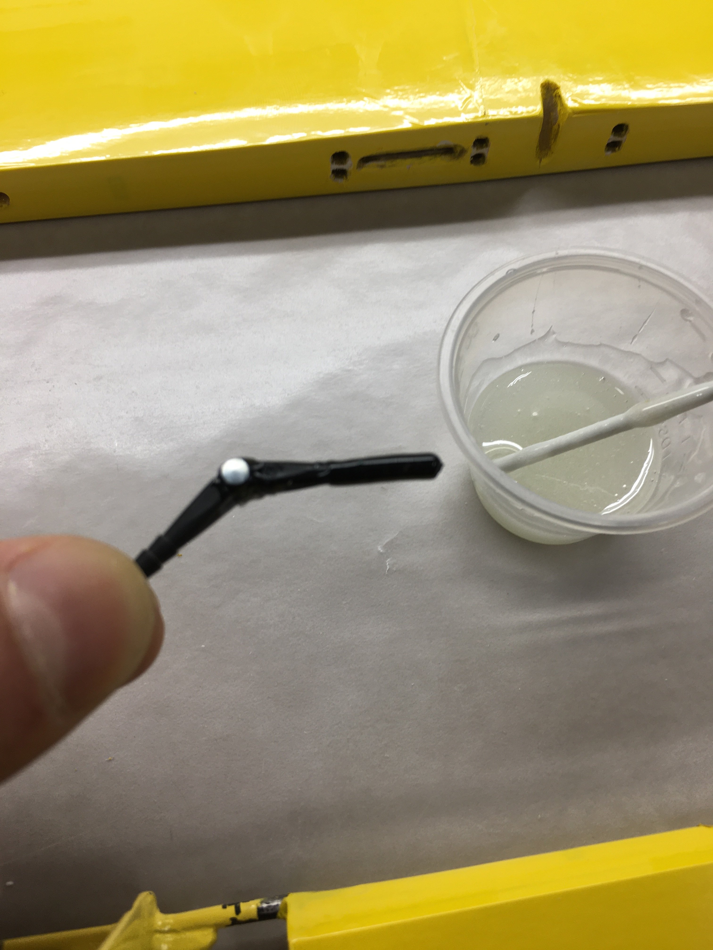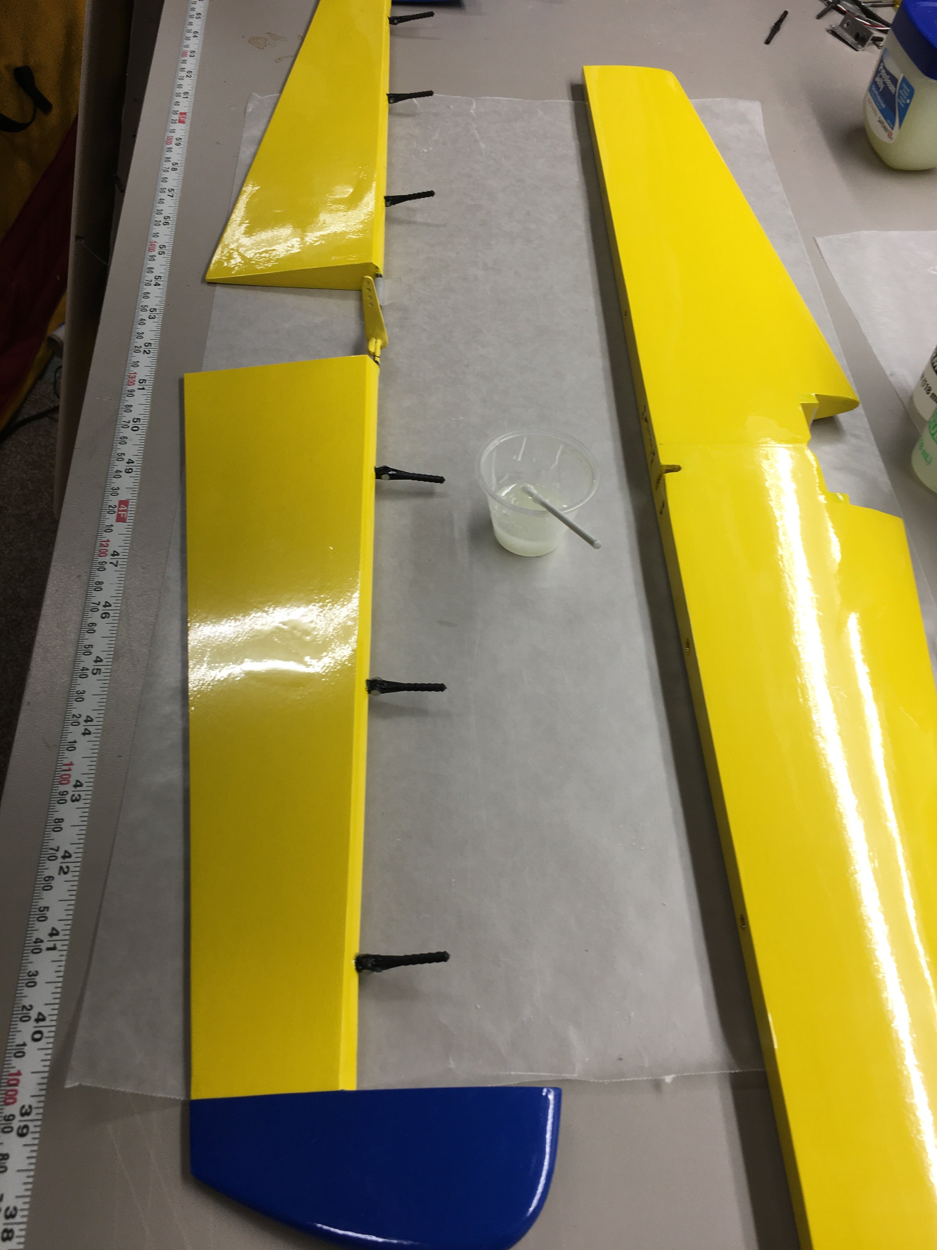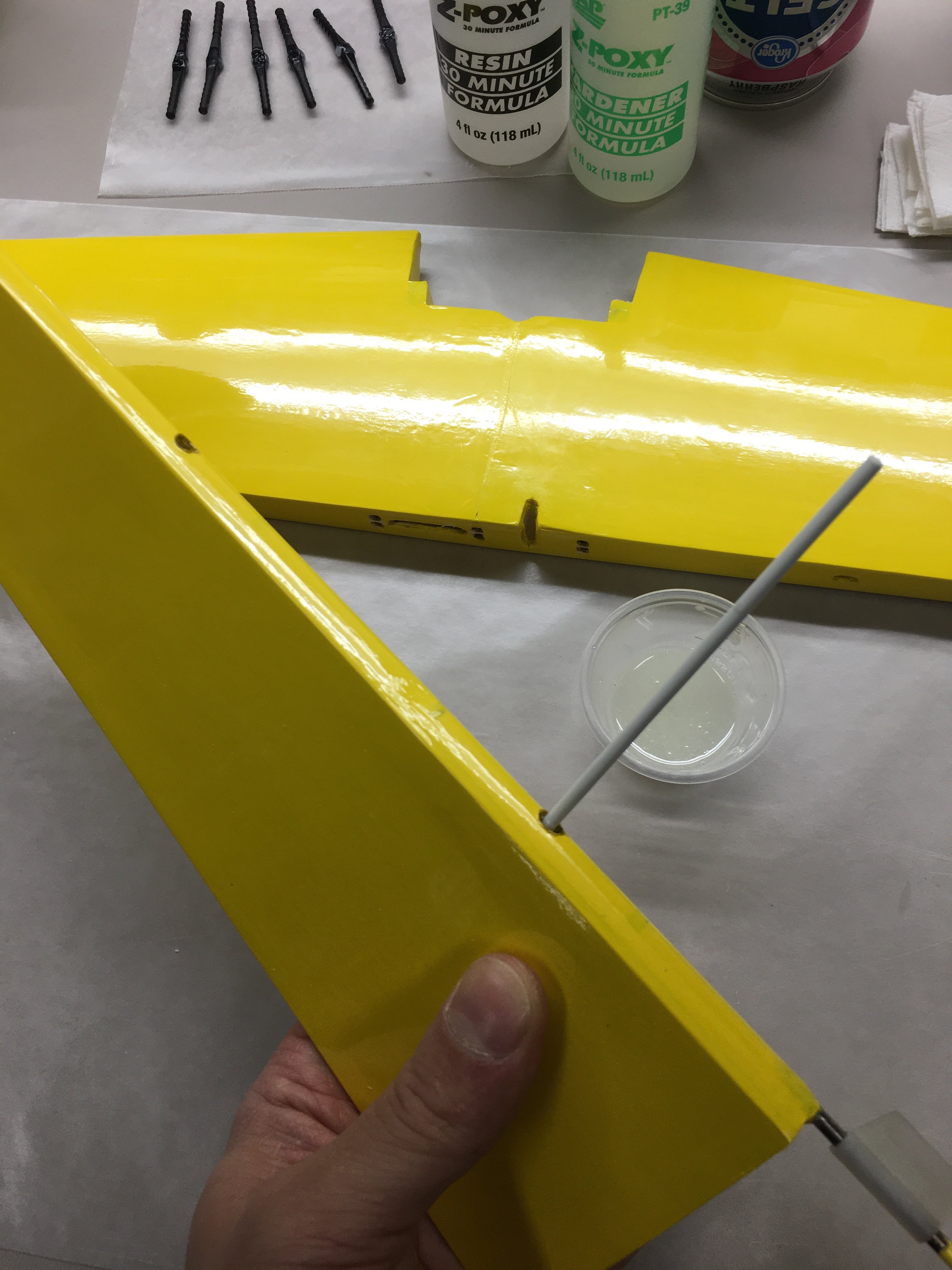 Using 30min Zap Epoxy, I mix it up in a mixing cup with a small plastic dowel used for rod building finishing resin. Use the rod to coat the epoxy inside the hinge holes. Lightly cover one barbed end of the pin by smearing with the mixing rod and insert into one half of the control surface. Do this with all the pins. You should have little to no excess resin. Do the other side and repeat.