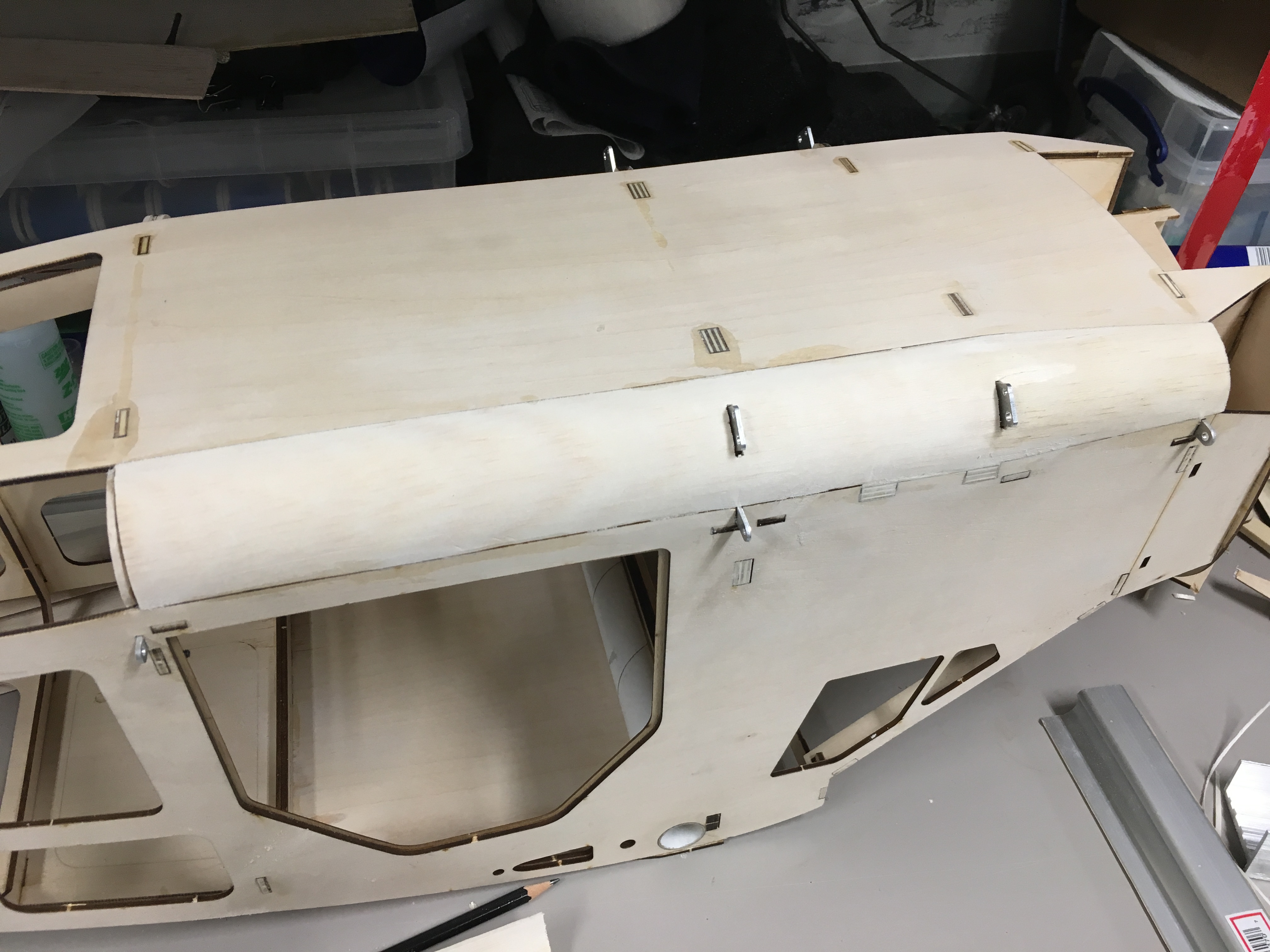 I glued everything down except the upper forward side and end. Here I soaked the balsa to allow it to bend with the radius without cracking. I was looking at the manual and even noticed a crack from the fitting to the radius. Mine started to on the first sheet, but was able to not make it crack too far and then proceeded to wet it.