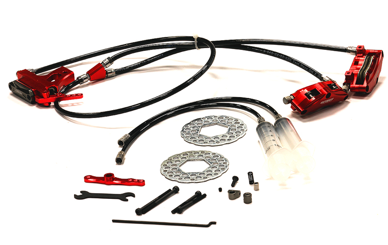 Thanks for that very interesting love to own a set just to play with.The picture is about 20% smaller than actual size. The disc diameter on the ones I had was 54mm or about 2-1/4". The hydraulic lines are 1/8" OD poly tubing. Integy makes some really nice ones too and they come in assorted colors....They also appear to have hose couplings on their hydraulic lines...pretty. Don't know the actual size of the Integy. The add said for 1/5 scale Baja 5B. And looking at the calipers it looks as if you can install the hydraulic lines perpendicular or parallel to the caliper and use either port for bleed.