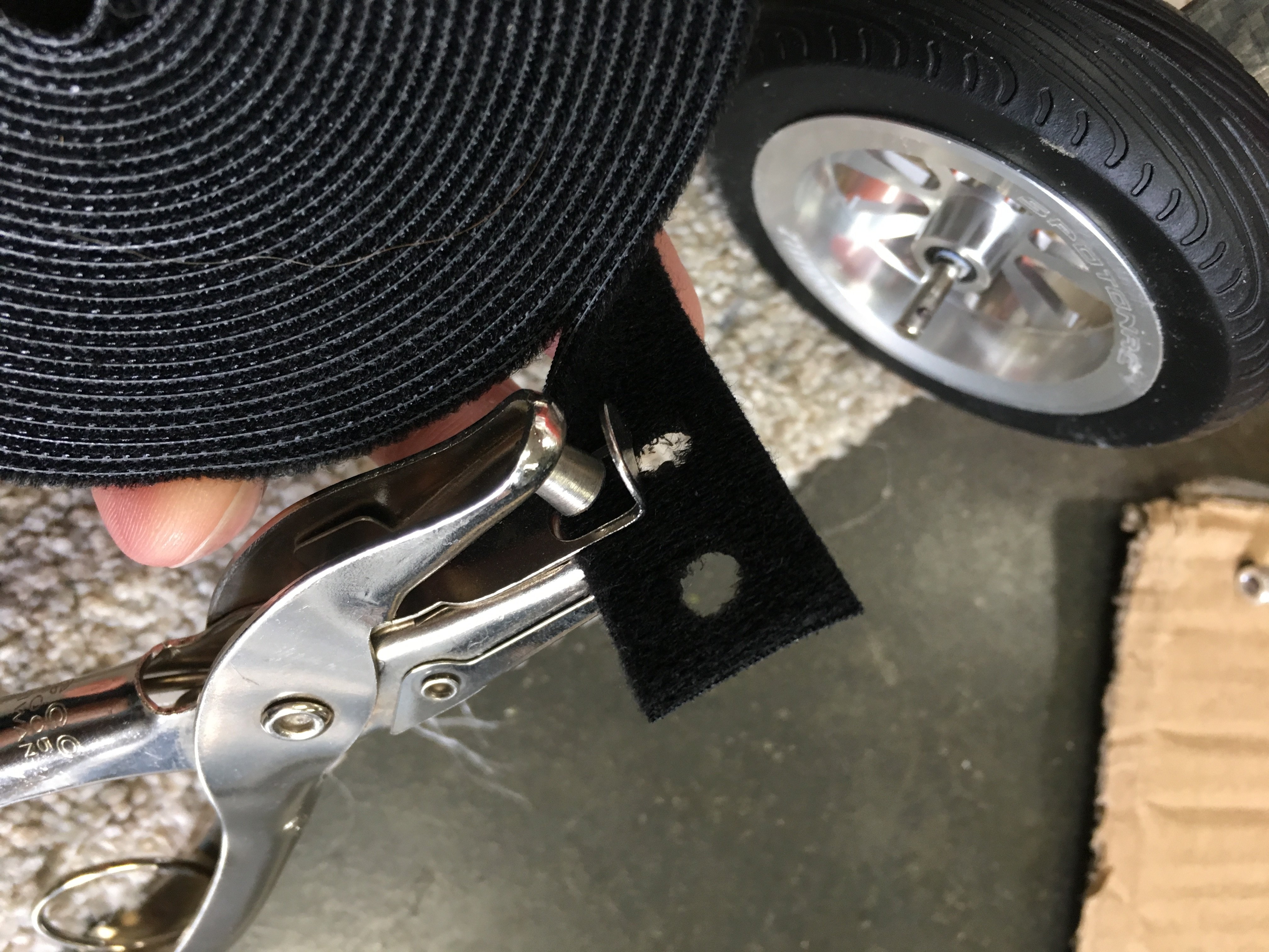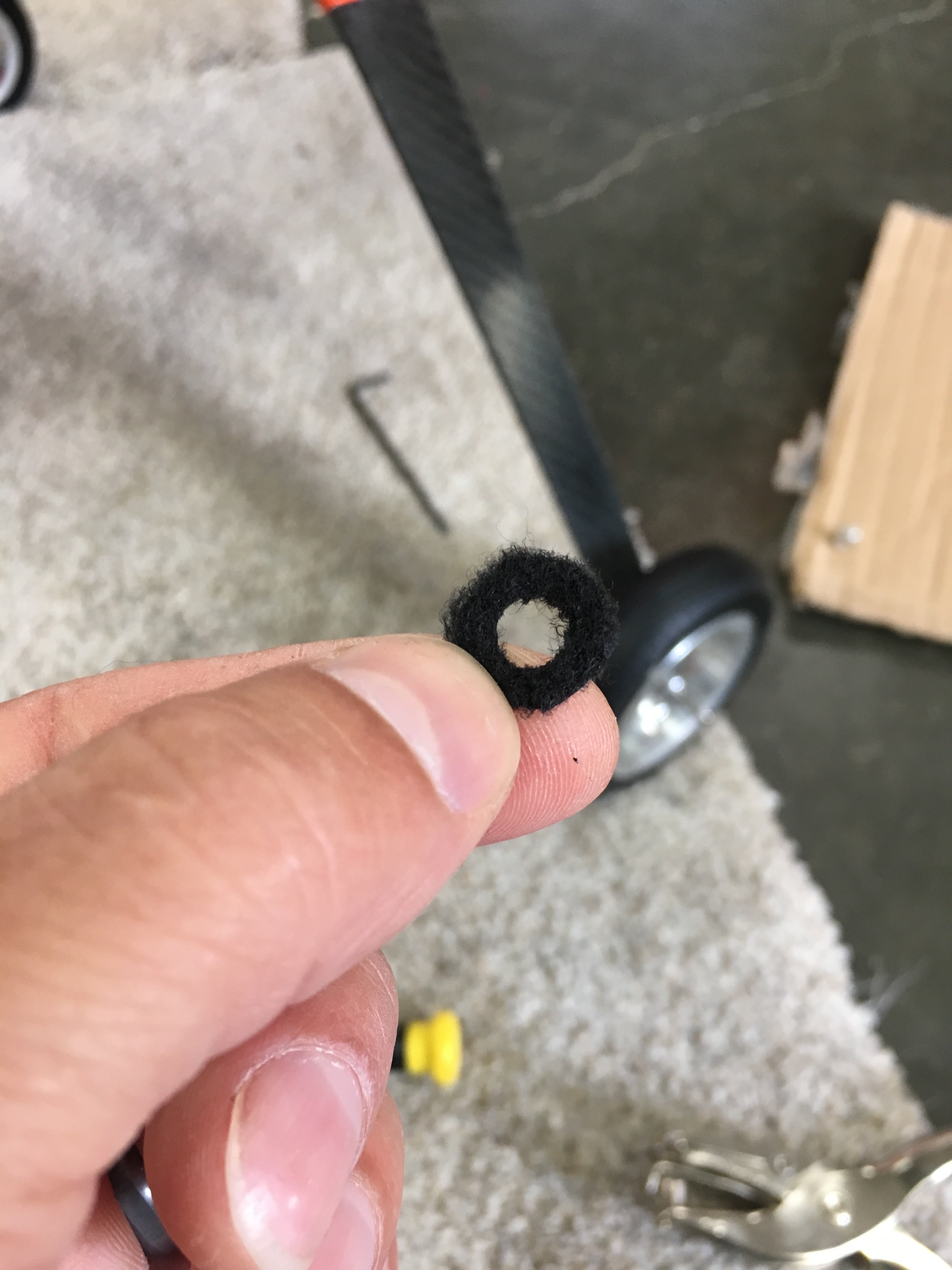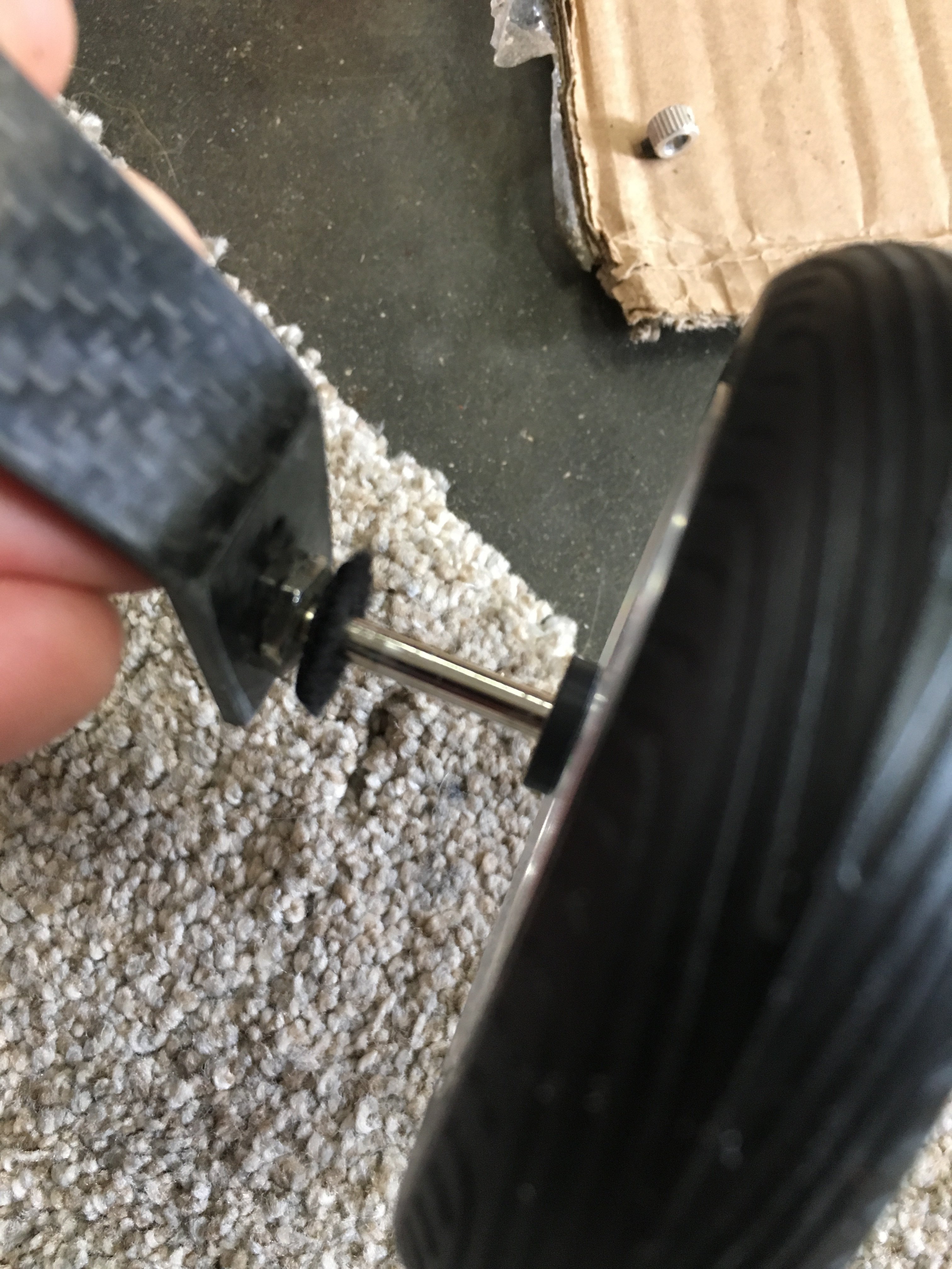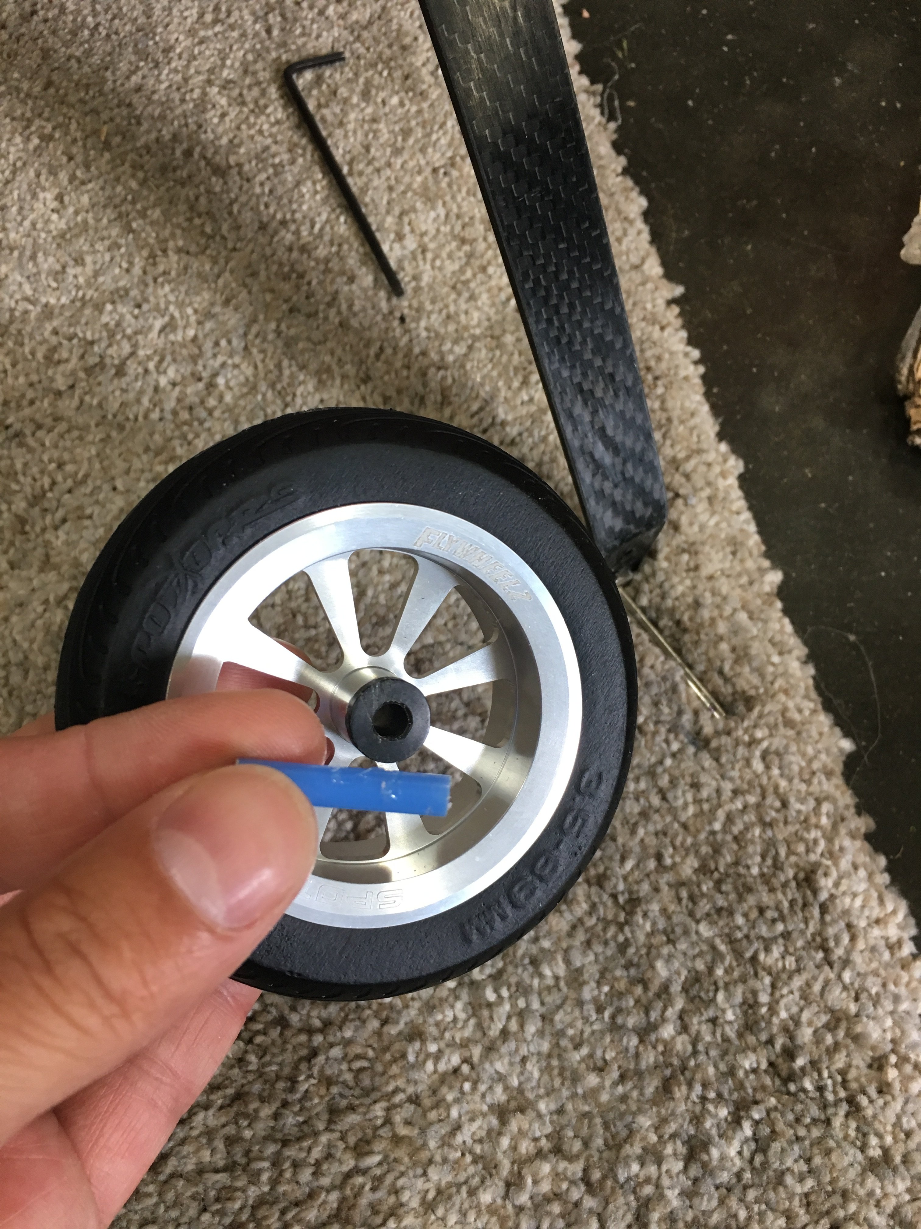 Removed the wheels and wheel pants, installed some 3.5” FlyWheelz. Had to make a little bushing to fit inside the wheel bushing to accommodate the stock gear. Added a little Velcro fiber washer to keep the friction constant.