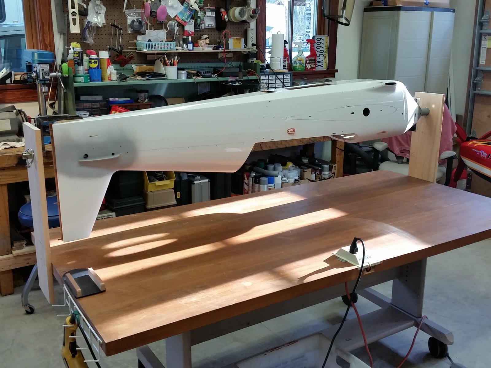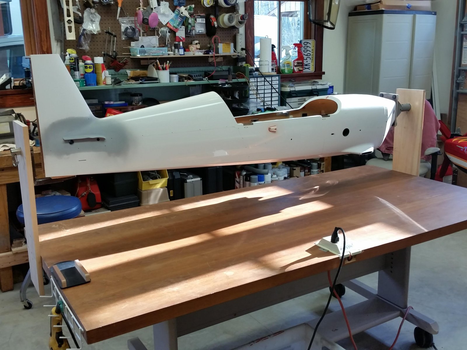 that looks awesome, should work great, I need you to work in my shop for a few weeks, then I would have a clean shop also LOLI'm thinking of a cradle like support, mounted to the end of my table, that I can rest the prop and spinner in.....which would allow me to grab the tailwheel and roll the fuse over, then slide a support box under the structure (canopy removed, of course).