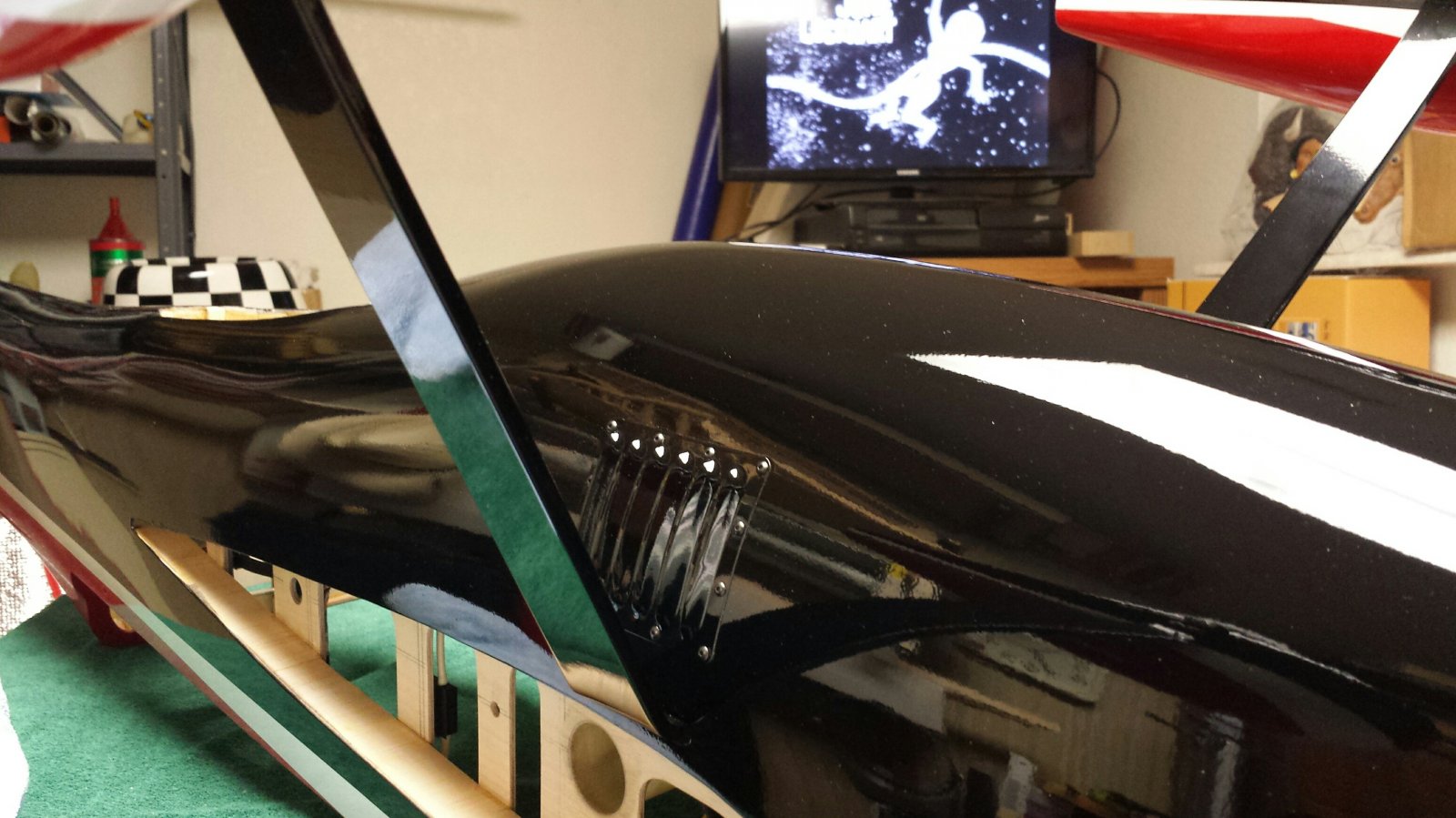 Well she's back on her legs. Some how I managed to drop a bolt for the landing gear between the outer fuselage and the pipe tunnel and it has totally disappeared. I'm sure I will find it the hard way some time. ;)