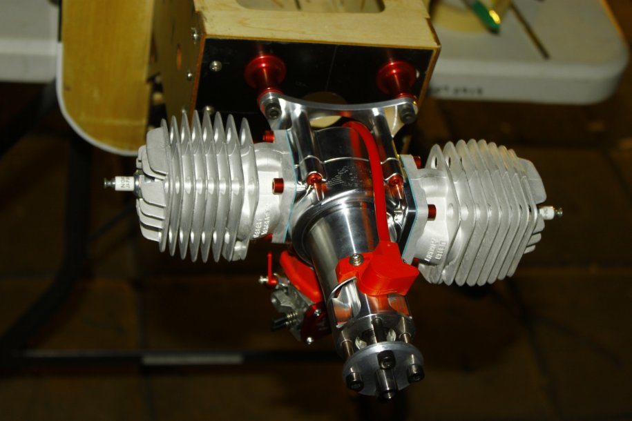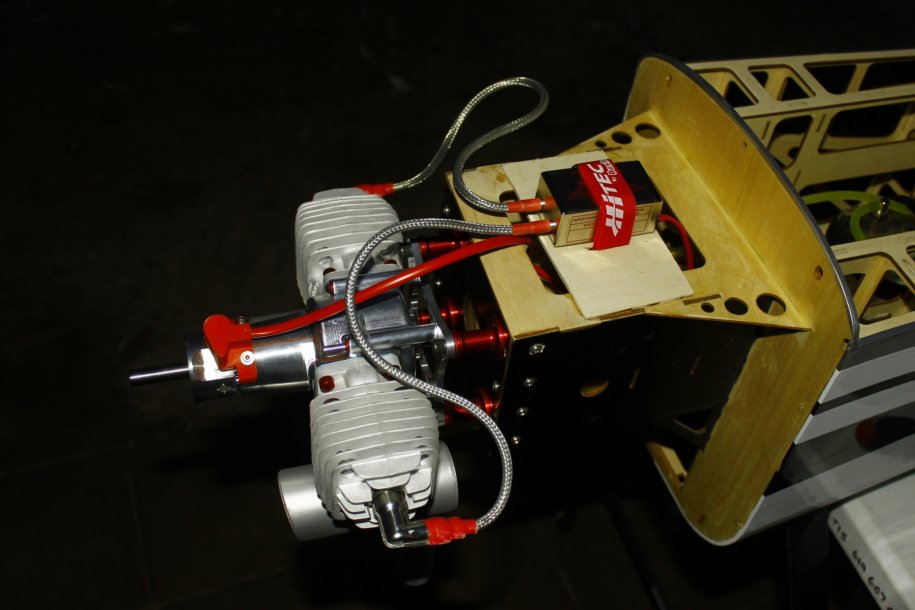 I got the tank plumbed up and decided to test run the engine. Just like a DA, started on the 4th flip, idled perfectly. With the Hitec HSB-9465SH servo controlling the throttle, she revs as fast as I can move my thumb!!!