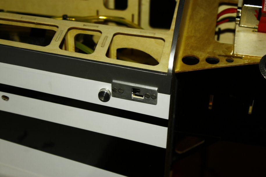 I waited until the very last step to place my rx switch because it depended on where I placed the receiver batteries. Because of the plywood structure inside, I did not need the outside bolts to secure the unit, the 4 inside ones clamp up against the plywood. This makes the switches sit more flush with the mounting plate which I like better.