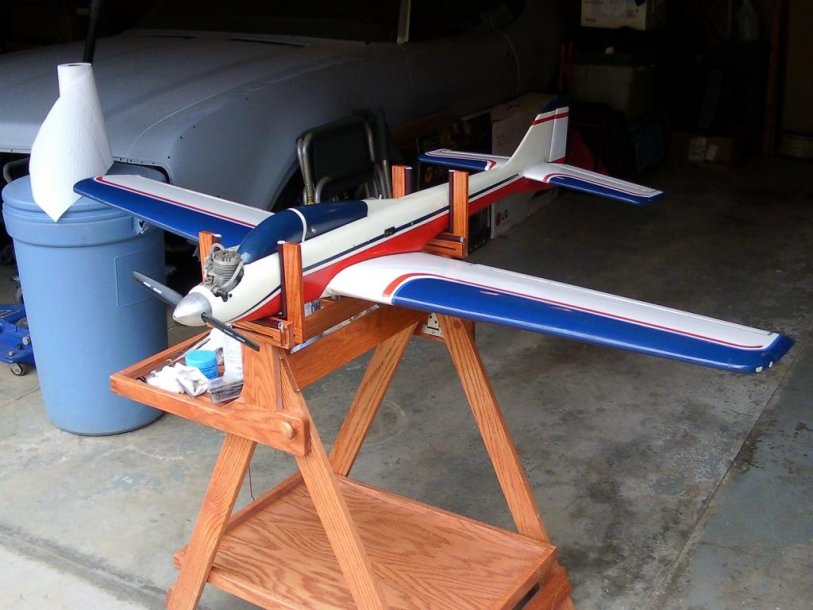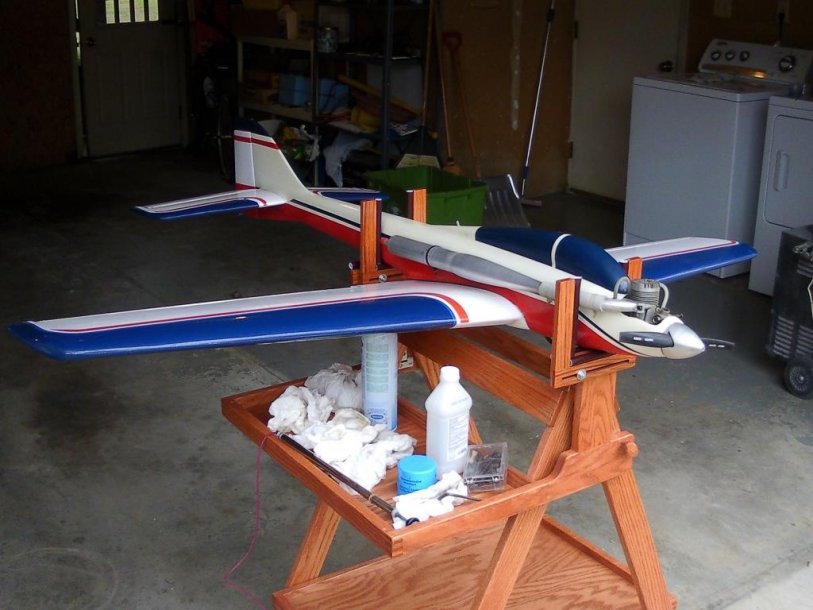 I built this one many years ago. I had seen something similar in magazine ads but had never seen one in real life. It took quite a bit of engineering to build it so the uprights that hold the plane would fold in and out and not need to be removed and still be able to expane for bigger airplanes. The whole unit also folds flat for transport. It's made of Oak so it's pretty heavy, but will probably outlast me. The worst part is I almost never use it.