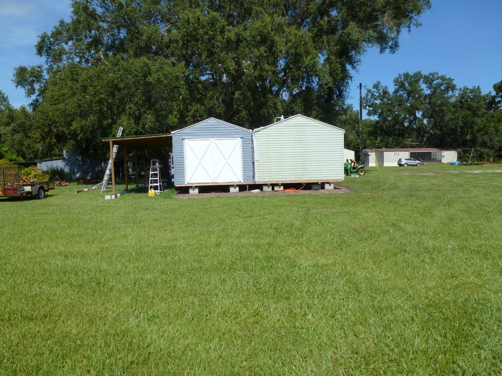 The green one is the previous shed/shop, the grey is new. The white ramp door I built to replace the cheap and un sealable roll up door and it is hooked up to a winch cause it is heavy. The siding from the back of the green shed will be used to replace both ends of the grey one. The roof between them will simply be a 25' sheet of rubber roofing material creating a 24' long valley. Maybe in a year or so I will recover it as a single peak, but not now I'm tired. There is another ten foot section of lean-to that still need's to be added to the left and on the right a new patio will be added in stead of just a lean-to. Also, the mobile home to the distant right will be removed from the property after the mother-in law is gone leaving that front acre+ an open view, maybe put up a nice wood fence across the front at the road. The silverish structure to the left in the tree's is a barn of the only close neighbor I have, whom stays to himself.