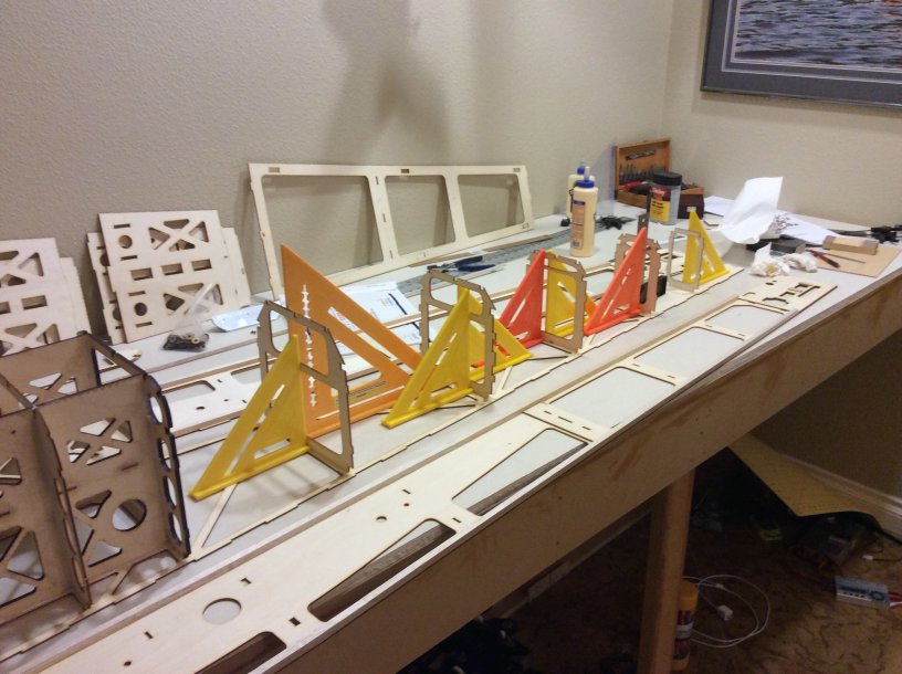 Very nice....OK. Back at it. Had to fix the temporary build table and turn it into the final one. I had about a 1/16" belly in the middle. That is fixed and now it is flat, flat, flat with no twists. Got the motor box glued to the fuse top plate and then the fuse sides glued up. Used heavy aluminum straight edges to keep the top of the fuse sides aligned with the top fuse plate. Bonus of using a sacraficial piece of 5/8" gypsum for the top is using pins! Also added some extra plywood for the rudder servo screws. Going push-pull with a single servo