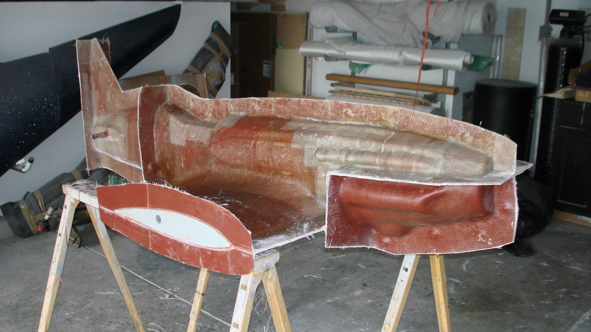 Construction of fuselage in fiberglass and carbon fiber, gel coated in white. Horizontal stabilizer removable, constructed in fiberglass and carbon fiber, gel coated in white. Fuselage and wing center section all molded in one piece. Wing tubes sleeves are already built in place. Composite flaps, gear covers, split cowl, Foam core wing panels (or wood for built up), wood for ailerons, rudder and elevator, canopy and wing tubes.
