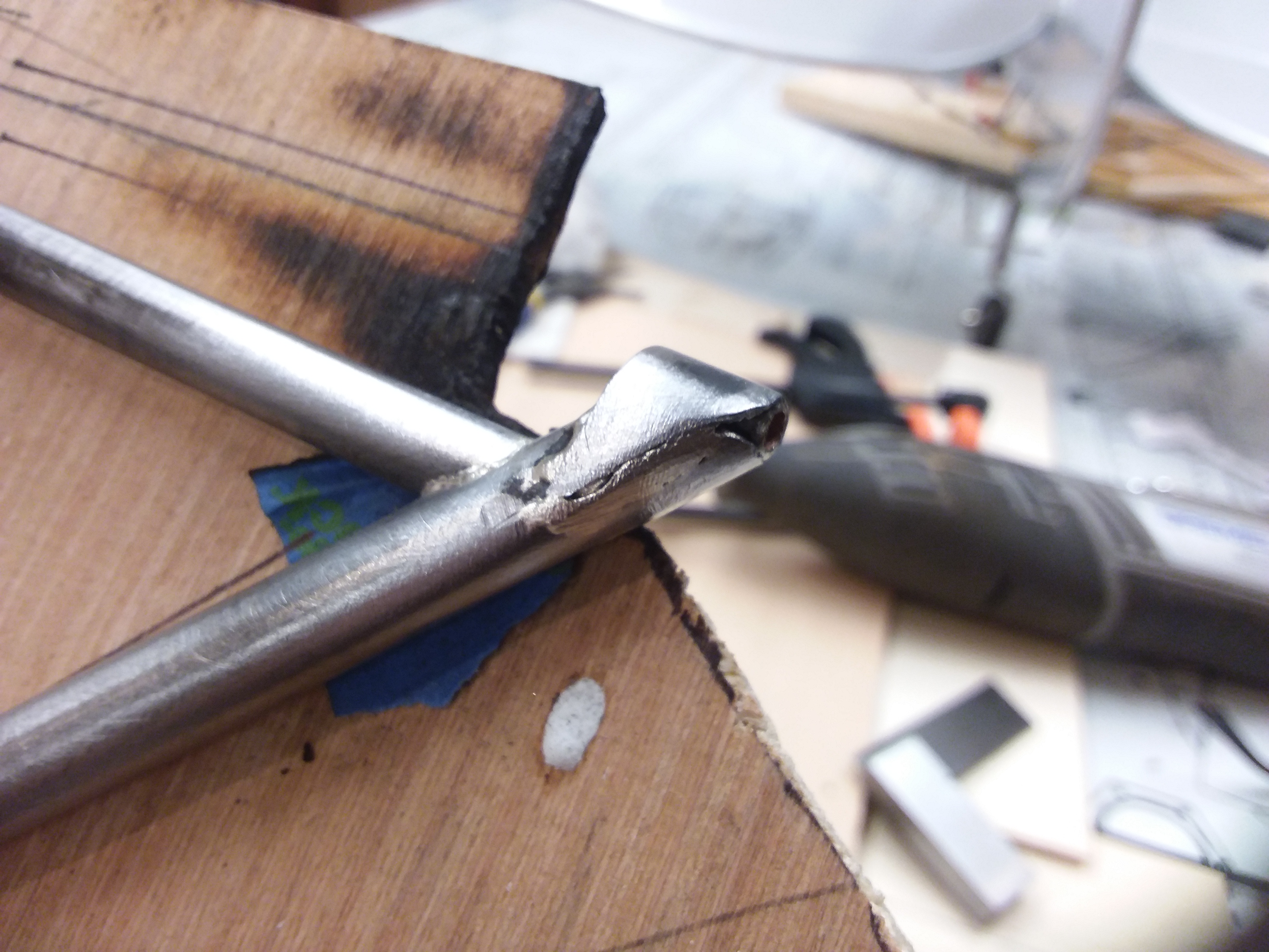 Continuing work on the landing gear piece. Polished the blackened flux away to expose a few holes in the solder. Much easier to fill in than the actual soldering, different thickness metals are not easy to solder.