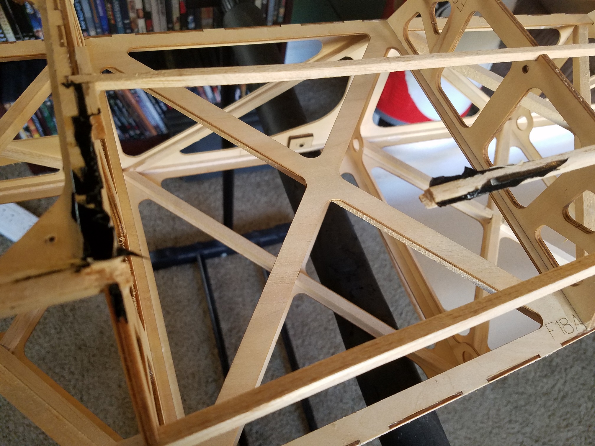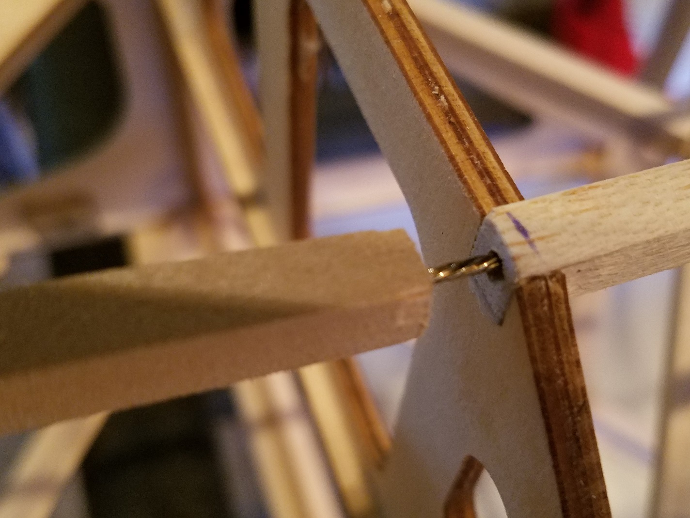 Evening gents. Been pre-occupied with so many other projects however I did manage to find a few hours to work on the 330 today. Between errands and other things that is. I wanted to get the broken/cracked stringers on the bottom of the fuse taken care of first. As is usually the case, the 330 had been picked up from the bottom and we all know what that does to those balsa stringers along the bottom. I am constantly catching myself before I even reach for one of my planes to remember, "Not from the bottom Moron". LOL. I have learned with each airframe there is different ways to move them around without grabbing on to the bottom. As with each picture you all will see the three stringers I intended to replace. I decided to extend the repair/replacement a little further so that I could be sure I could get a good joint. Instead of replacing the broken stringers with balsa, I decided to "beef" up the bottom a bit. And since I had some left over 1/4" Spruce stringers, that is what I used. I drilled the "receiving" end of the stringers and also the replacement stringers as well. Then "pinned" them with "pull/pull" cable sections. Normally I would "angle" cut the stringers then section the new ones in. But really I didn't want to add a bunch of supports to keep the structural integrity the same. So I chose to "butt" join them with the cable pins to tie them together. Then simple little "saddles" for the replaced stringers. Once I had the cable pins glued in place along with the spruce stringers, I tested the strength of the joints and I was pretty impressed of how solid "and" strong the joints are. I'm sure the bottom stringers are responsible for very little structural strength, but more over for fuse shape when covered.