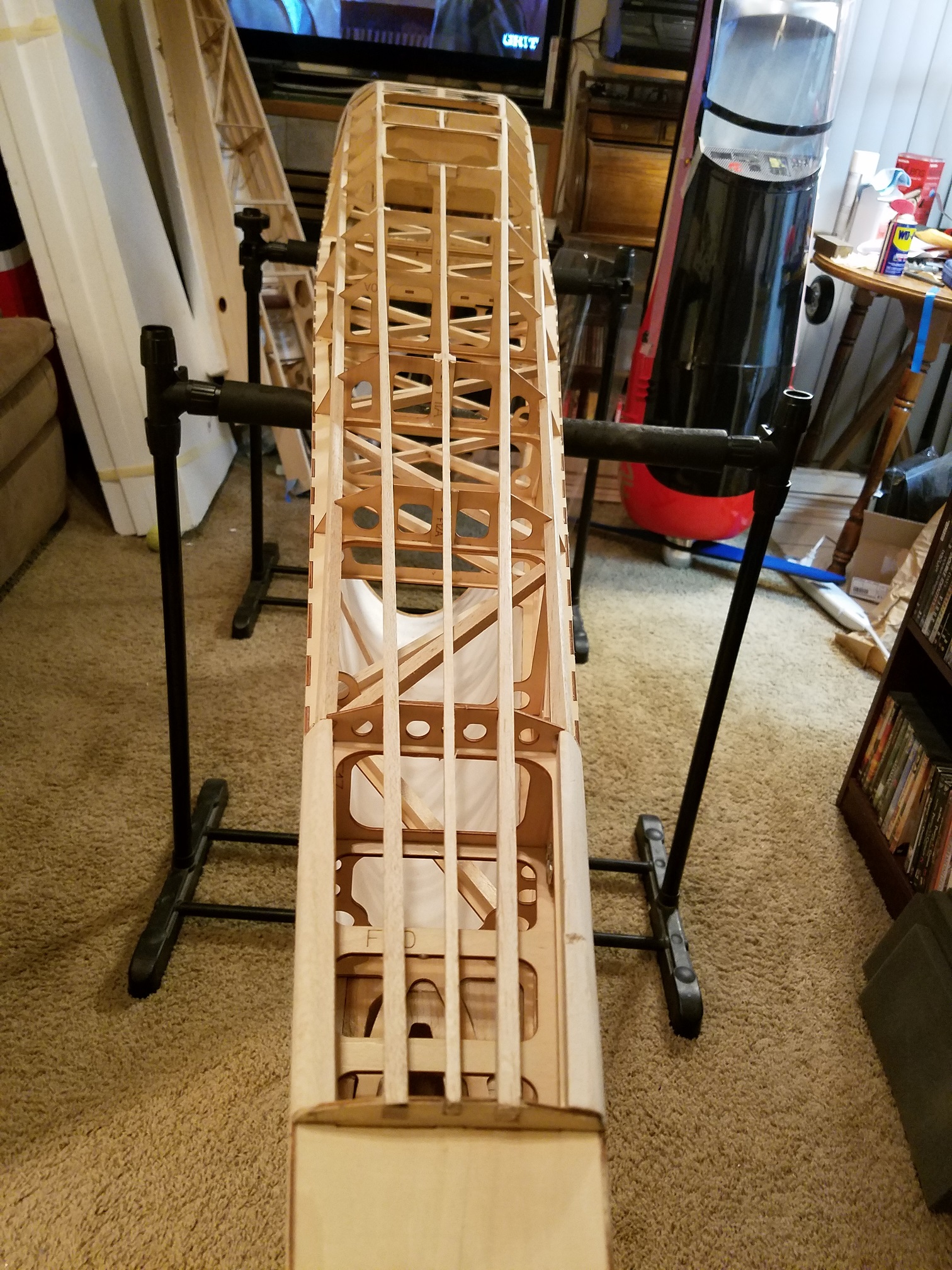 I am pleased with how nice the bottom of the fuse looks now. A little light sanding to knock off the previous covering adhesive and she will be ready for covering. I did however notice there is a couple of bad spots on the forward fuse sheeting. So I will remove the complete sections on both sides and replace it with new balsa sheeting. I still have to fix that one little bad area on the fin, but really not that big of a deal.