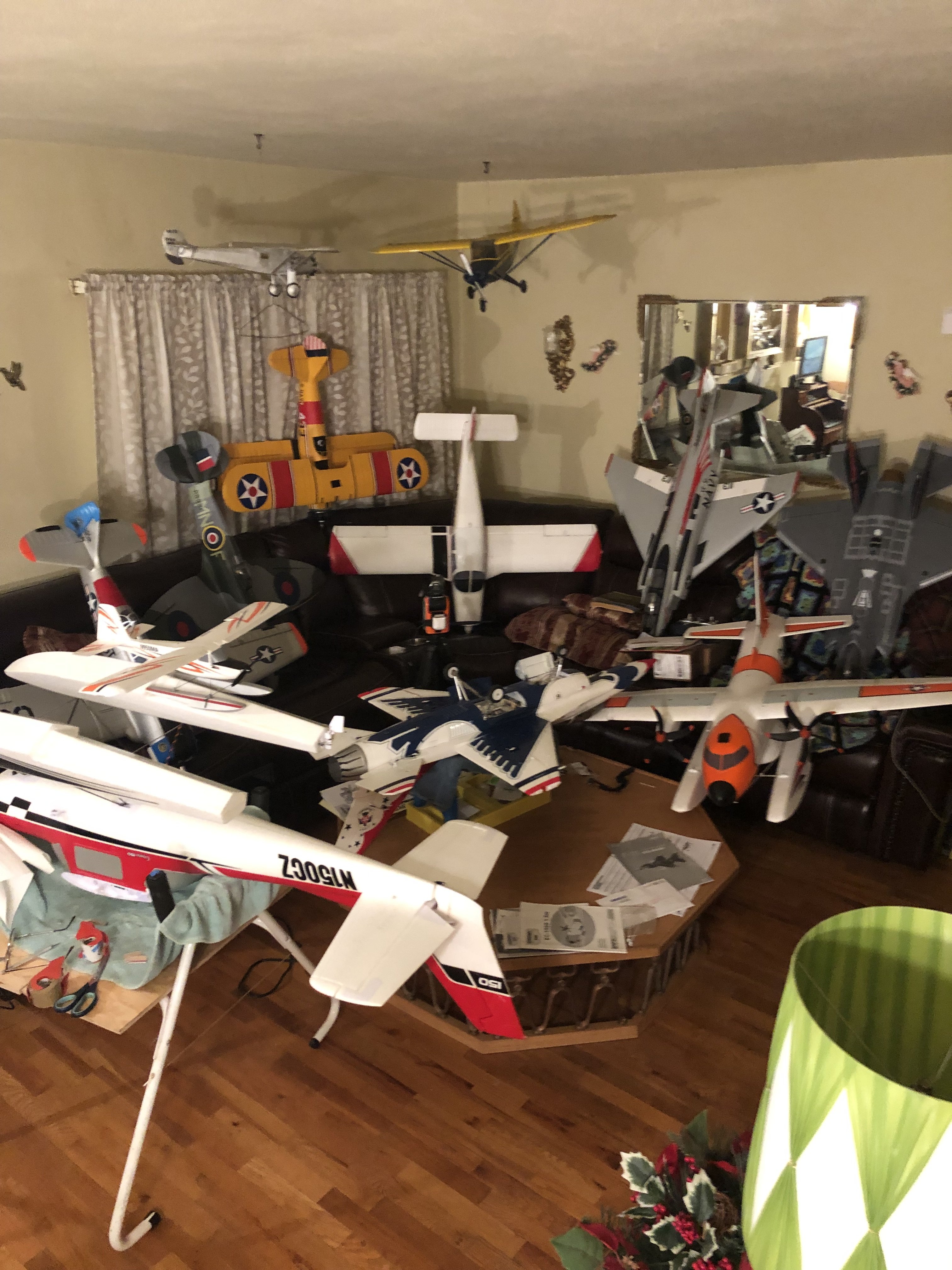 Here are a few of the Foamies I have been flying lately AT-6 Texan, Spitfire, PT-17, Piper Cherokee, F-4 Phantom, F-35, F-16, C-123 Cargo (E Flight) Cessna 150 Mini Timber, regular Timber, Turbo Timber S2 Cub and there's more in another room. All my Gasser's are in the Basement. and more in the Garage.