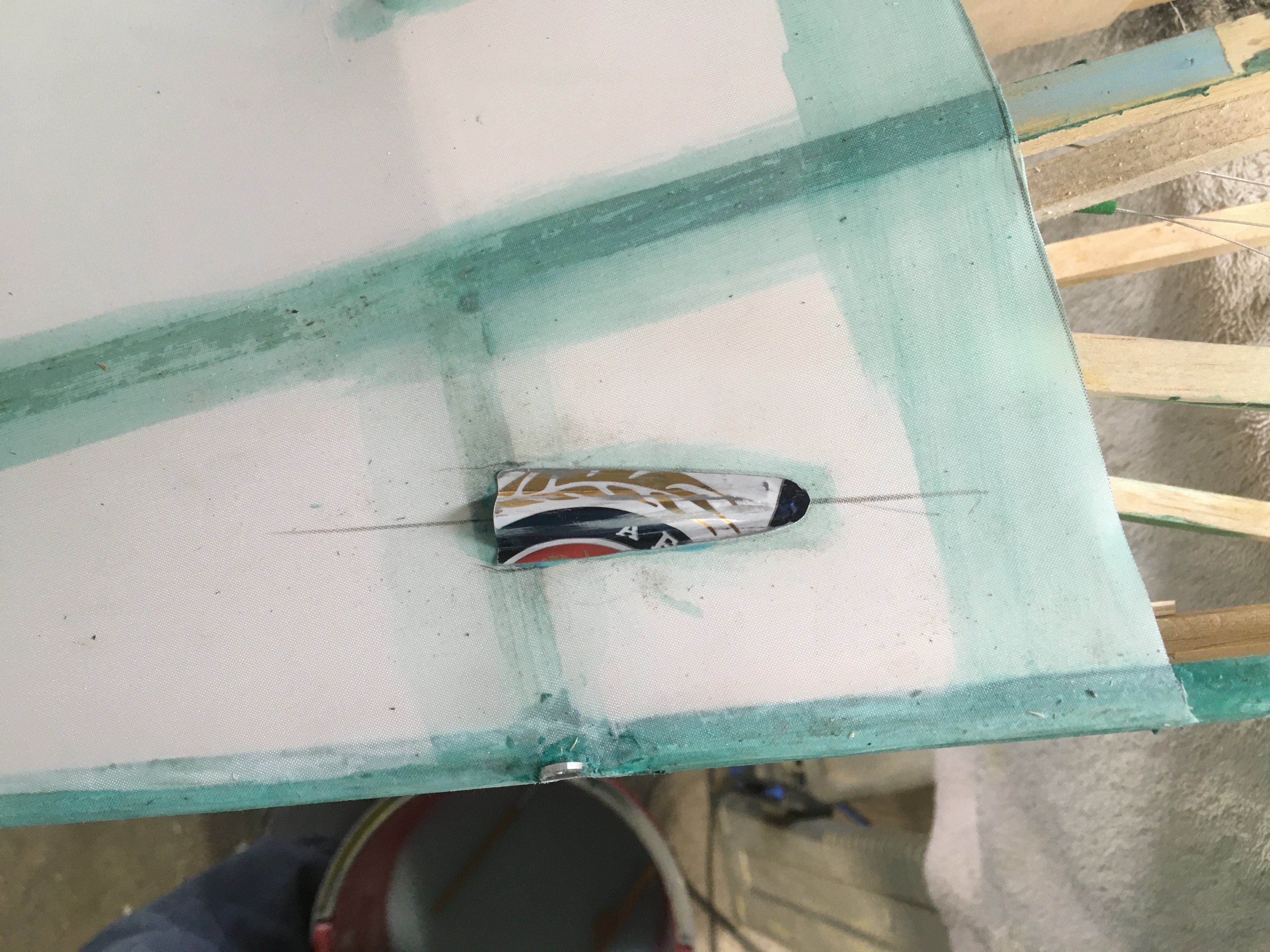 Before the front pieces of fabric are installed, need to provide the cuts for the rudder cables. Rounded a piece of 3/16 aircraft plywood to serve as a buck to fashion the covers. Looked around the shop for suitable material and decided to use a beverage can from the trash can, maybe that was the problem last night? The covers are glued in place with EkoBond, once dried and set with a 200f iron, preshrunk fabric reinforcements are installed.