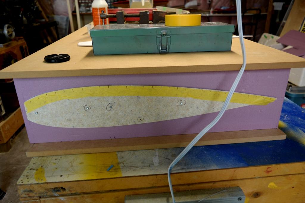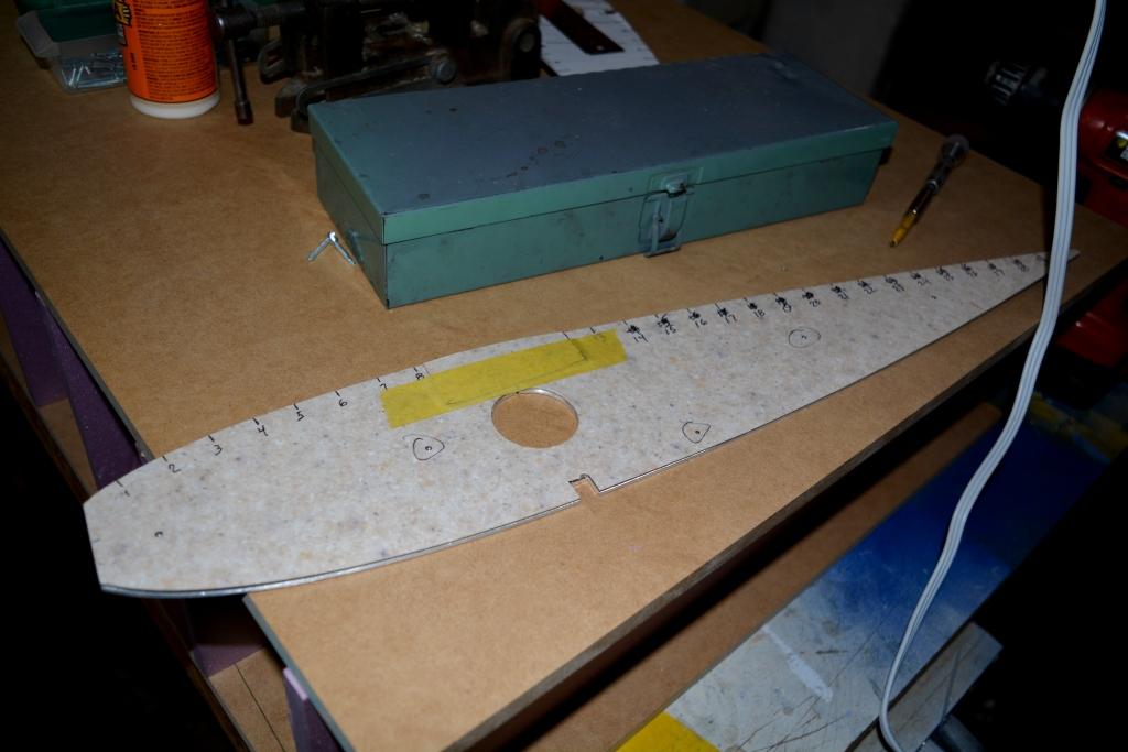 a bit more done, in preparation of the actual hotwire, you will notice an aluminum landing gear which I converted to a hot wire cutter, for the tube holes in the first few ribs,