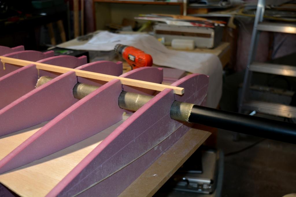Now that the wing has been sheeted to one side, before the top side can be sheeted, a lot of work has to be done , so the top spar has been added , and the holes in the 3 ribs for the aluminum tube socket has been hot wired but it still has to be sanded and enlarge while doing this, to make sure the fiber glass socket, I am making fits in as well , the photos should be self explanatory .