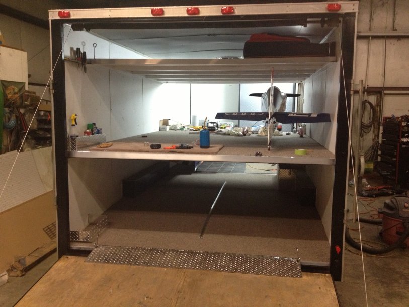 Lower deck from door back holds 100cc ultimate with wings on, box for 2 batteries, charger power inverter and 24 volt power posts