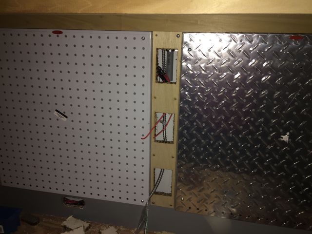 Got a lot done on the trailer today. Should have it done tomorrow. Final trim, plane restraints, back speaker wiring and poly on the cabinets. I did not want to drill a big hole in the side of the trailer for the 120vac plug so I came up with this under the trailer.
