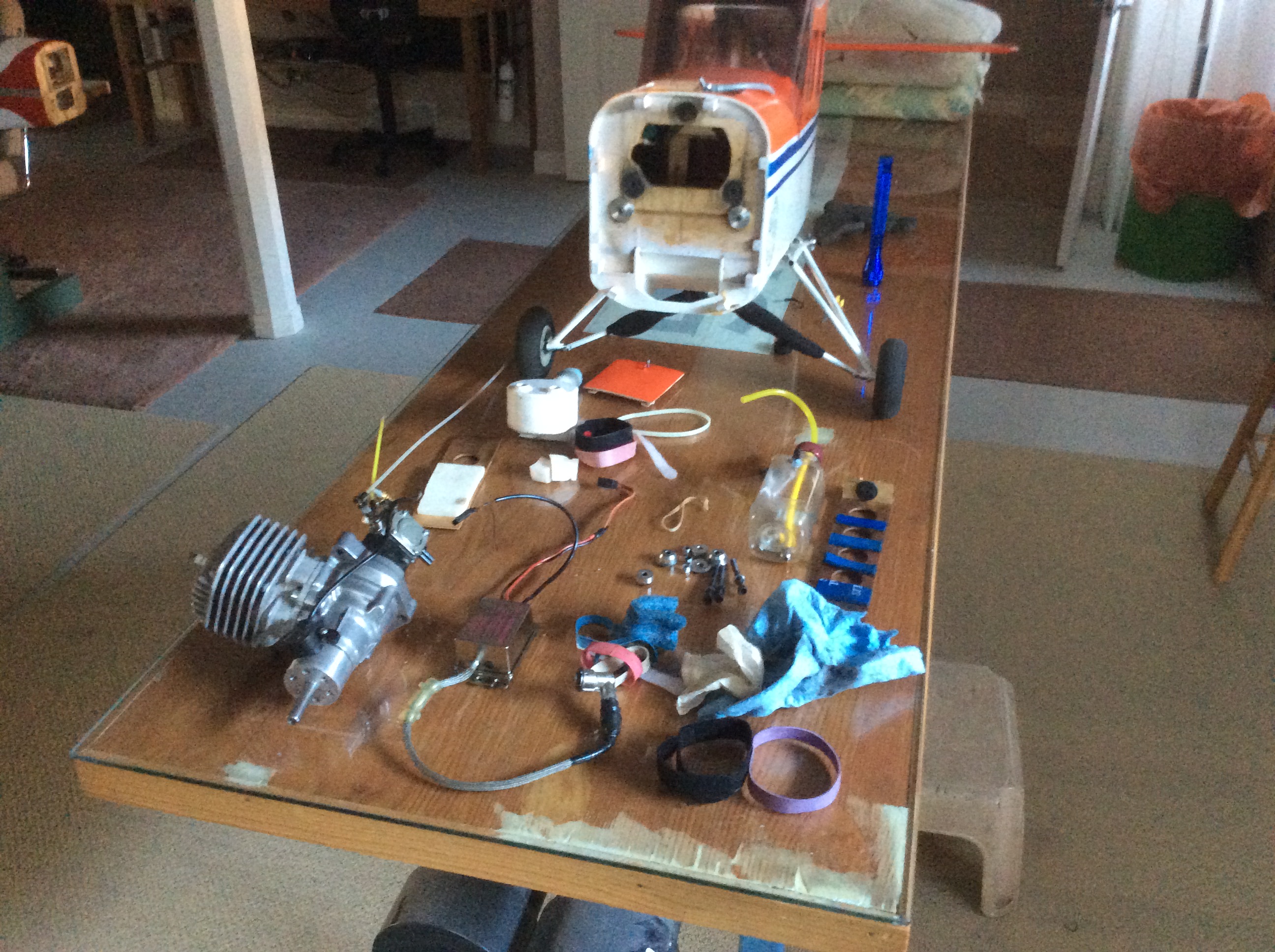 Went flying yesterday but the Decathlon just would not run. First time in 12 years or more. I just hate working on a plane at the field so after a short while pack the plane up and pulled out my spare plane and had a good day at the field a little on the hot side at over 95 degrees F. So this what the Decathlon looked like after we got home from the field.