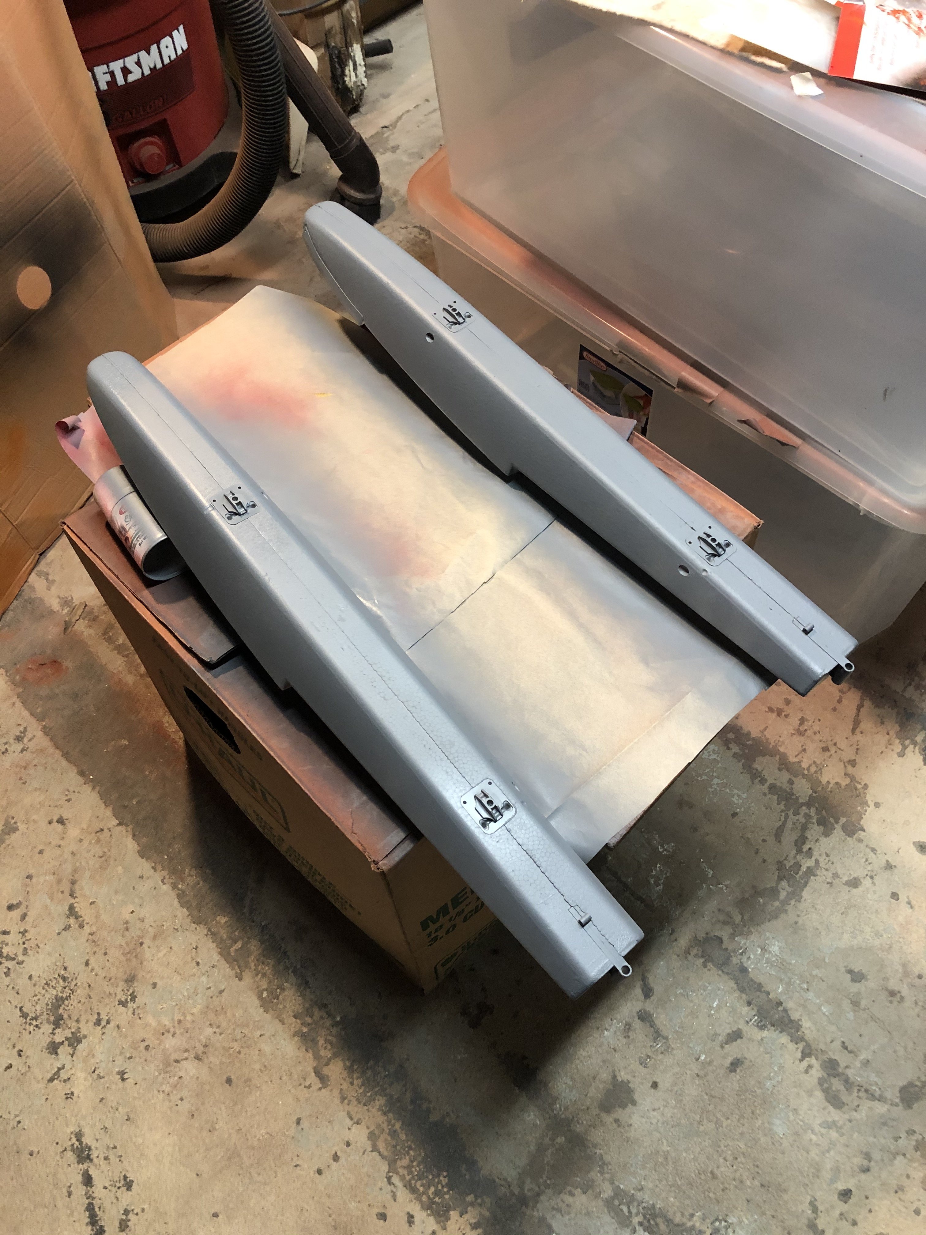 Where an aileron or an elevator half went I don't know so we decide to cut them out of balsa. A bandsaw here, a sander there and before you know it he is painting sanding sealer on the new pieces. No glass, just straight to spray paint ( some sort of camel tan) like the rest of the plane. A few logos and stencils and this plane will have a second life.
