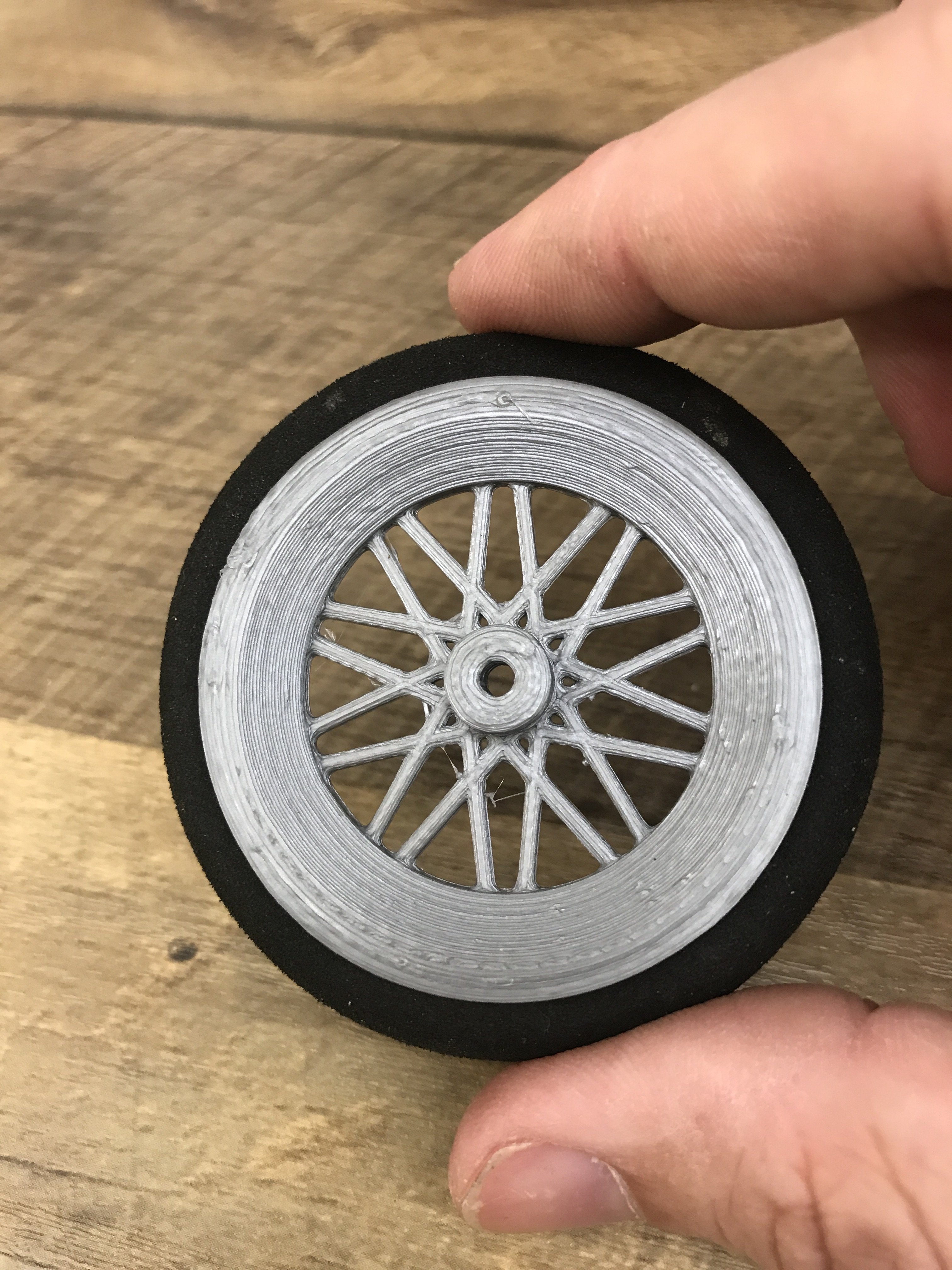 I have it setup to print in two halves to make it print better. My plan for tires is the cheap hobby king ones I have to just pull the foam tires off and use it on here. I wanted to have the offset but I actually think the way it would print would make it weaker. I plan to draw one with it offset though and try it at some point just to see. According to the slicer software it will use 8 grams of plastic to print one complete wheel.