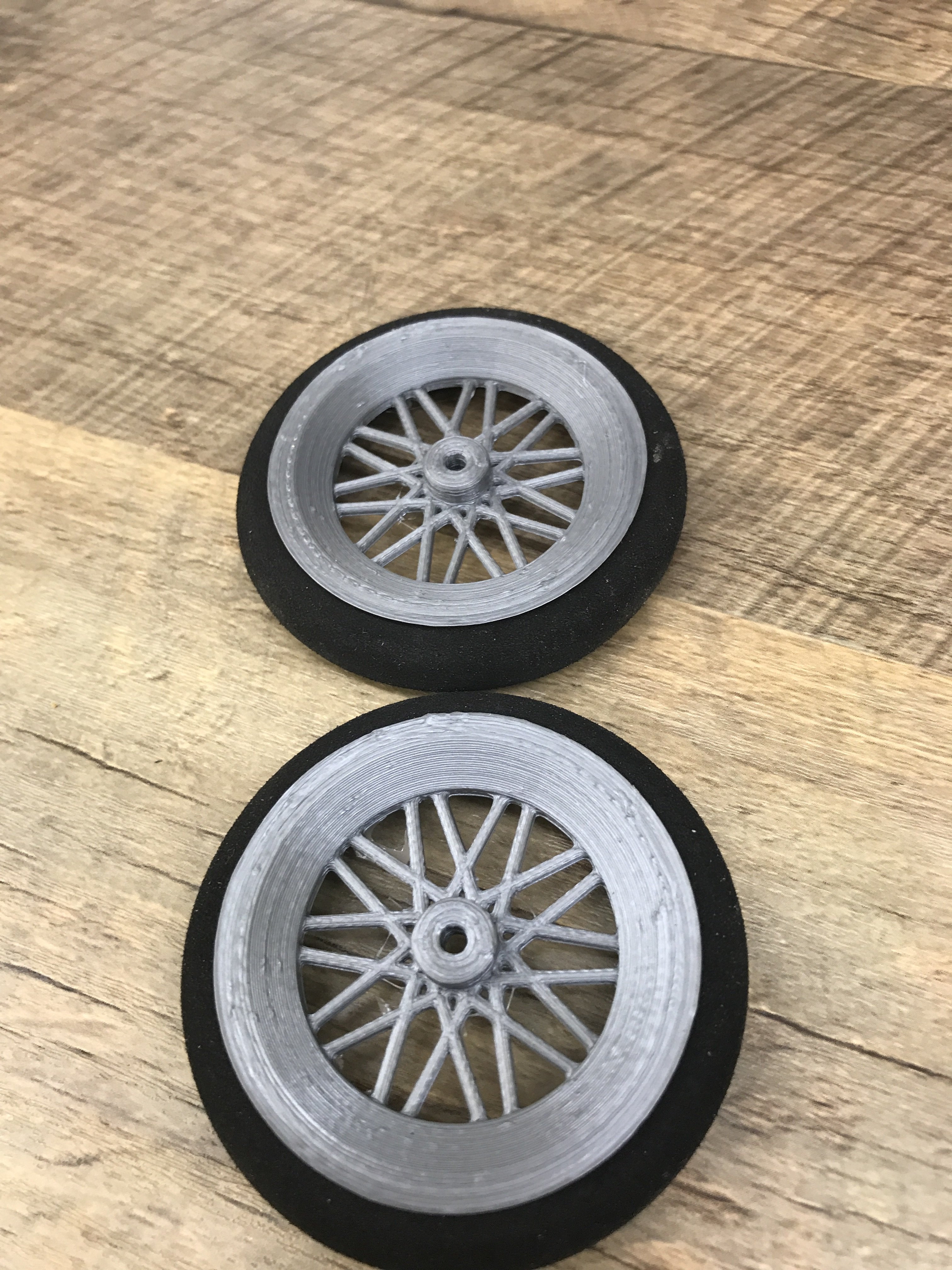 drew up a couple options of vintage style wheels for the plane I'm designing. they are designed in two halves so I can 3D print them and will use 2-1/2" tires or if I come across some of the printable rubber then I can print them as well. If anyone would like the files I will be more than happy to share once I have a successful print and know they fit like I would like them to.