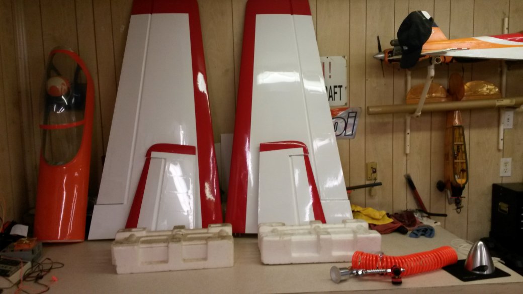 Wings and stabs are done. On to the rudder and the bottom of the fuse. Another roll of Missile Red should be here tomorrow for the fuse bottom. Because of measuring for the turtle deck incorrectly, twice, I'm now on my 5th roll of red. Klass Kote paint recommended by Ortho is also on the way and the spinner came in last week. Decals are on the way from B and E graphics. Next week should see some real progress. I also got in the silicone fuel line to redo the pipe supports before I cover the bottom of the fuse.