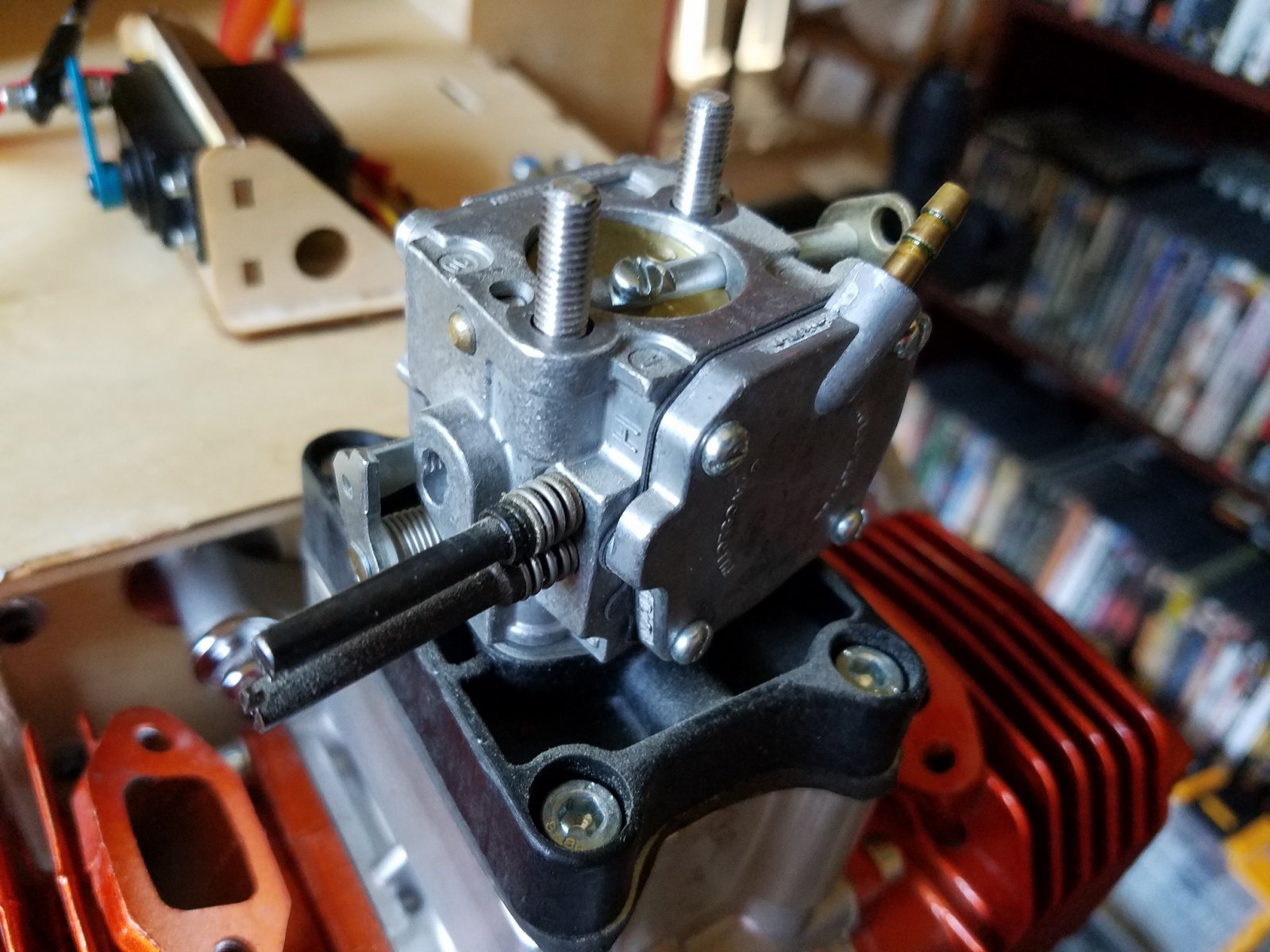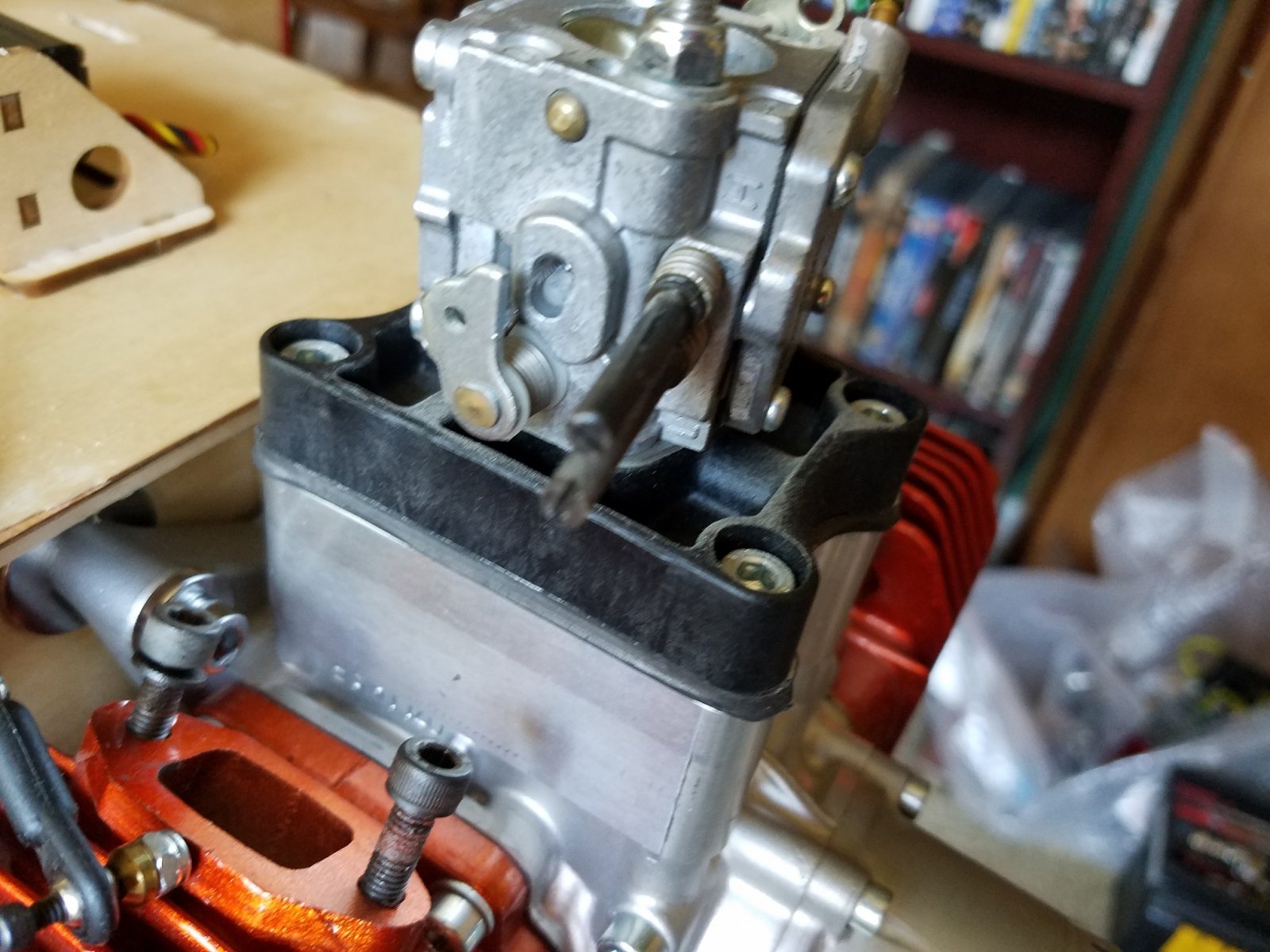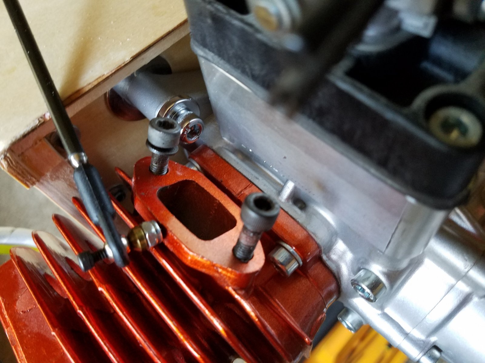 First remove the original phenolic carb base and "rubberized" coated reed cage assembly. Sorry everyone. For those that do not know, 3W originally manufactured their engines with phenolic or plastic post carb components. That being the carb base, reed cage assembly and reed block assembly. Though they worked fine for some and for a good number of years, there have been many cases where after a period of time, the parts will start distorting and warping due to heat and cool down cycles. And age too. Causing air leaks and poor tuneability of the carburation system. The rubberized reed cages would "peel" after a period of time and also causing some issues. The reed blocks would split down the sides where the bolts go through. To stay on top of the game and maintain the highest degree of quality, 3w revised all the components. Now made of high quality aluminum components separated with gaskets, the "dub" engines continue to produce amazing power and dependability. And no more worries with worn out or faulty carb parts.