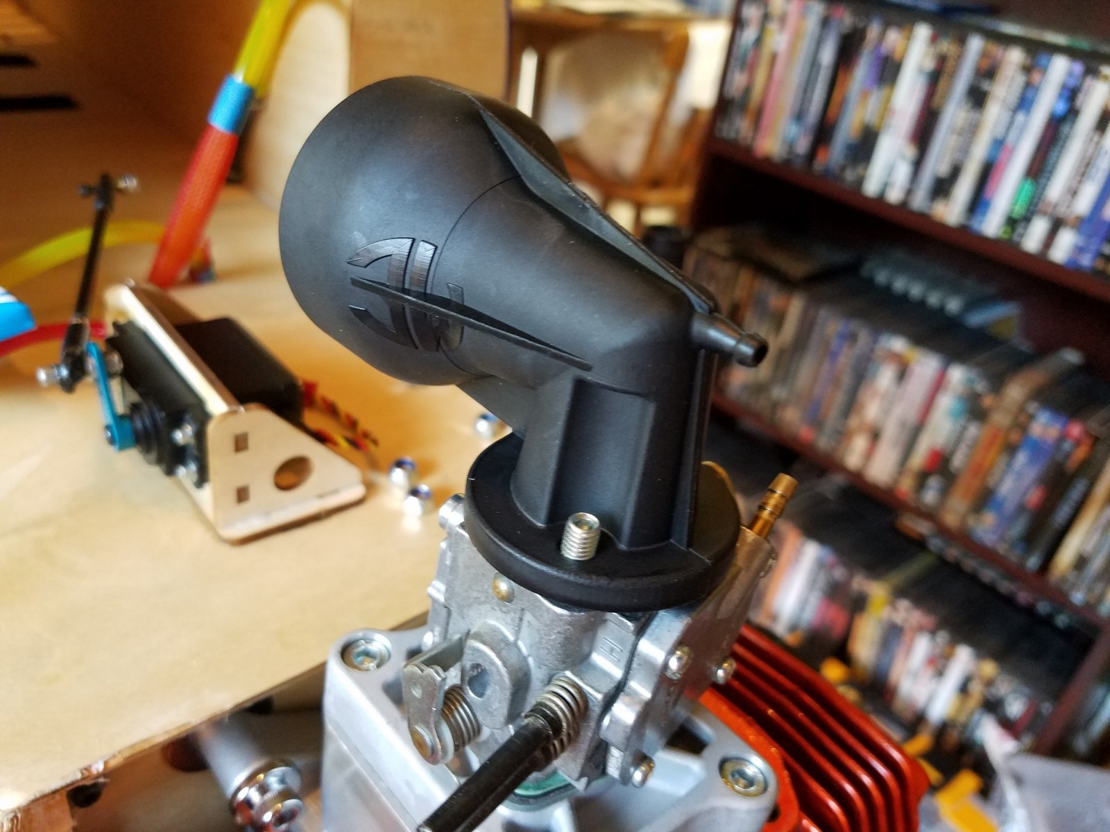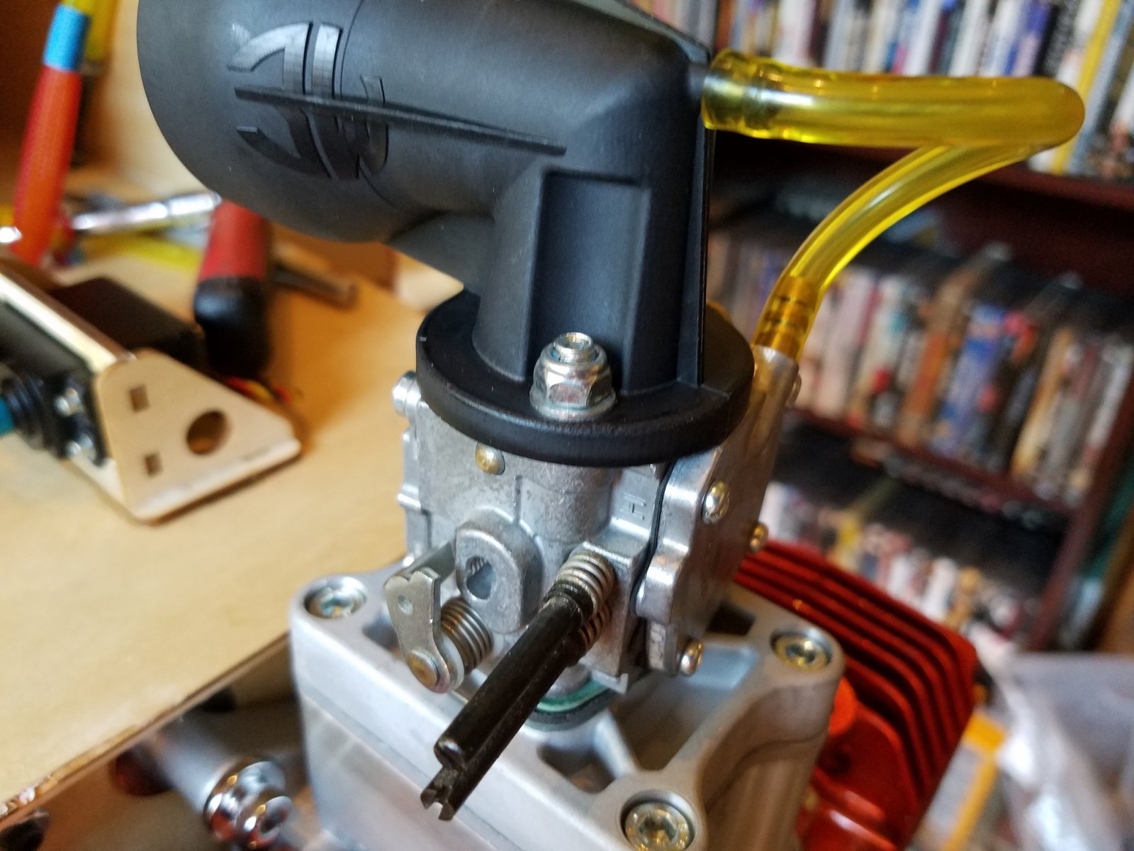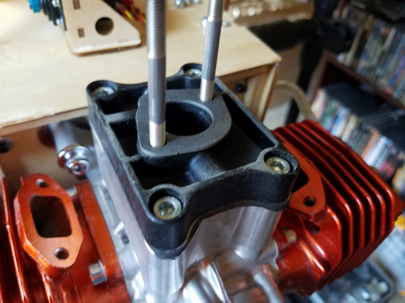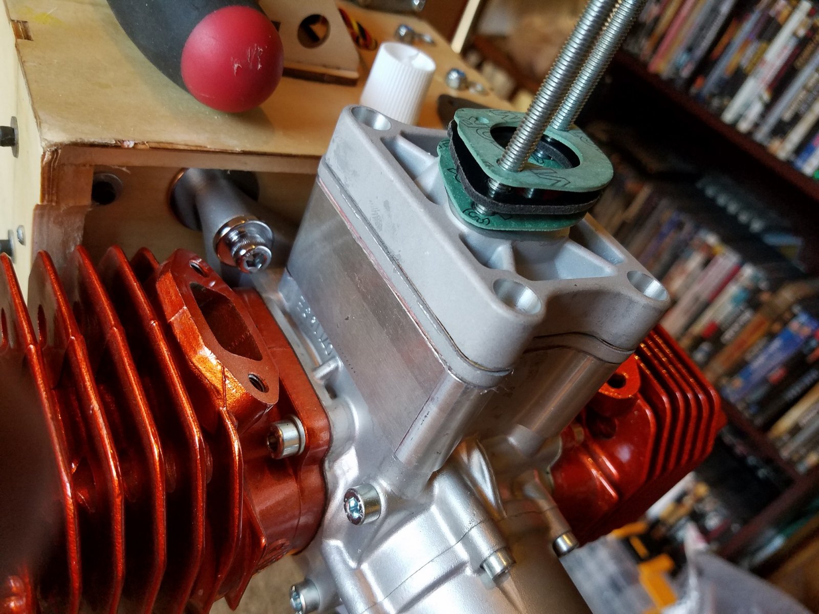 First remove the original phenolic carb base and "rubberized" coated reed cage assembly. Sorry everyone. For those that do not know, 3W originally manufactured their engines with phenolic or plastic post carb components. That being the carb base, reed cage assembly and reed block assembly. Though they worked fine for some and for a good number of years, there have been many cases where after a period of time, the parts will start distorting and warping due to heat and cool down cycles. And age too. Causing air leaks and poor tuneability of the carburation system. The rubberized reed cages would "peel" after a period of time and also causing some issues. The reed blocks would split down the sides where the bolts go through. To stay on top of the game and maintain the highest degree of quality, 3w revised all the components. Now made of high quality aluminum components separated with gaskets, the "dub" engines continue to produce amazing power and dependability. And no more worries with worn out or faulty carb parts.