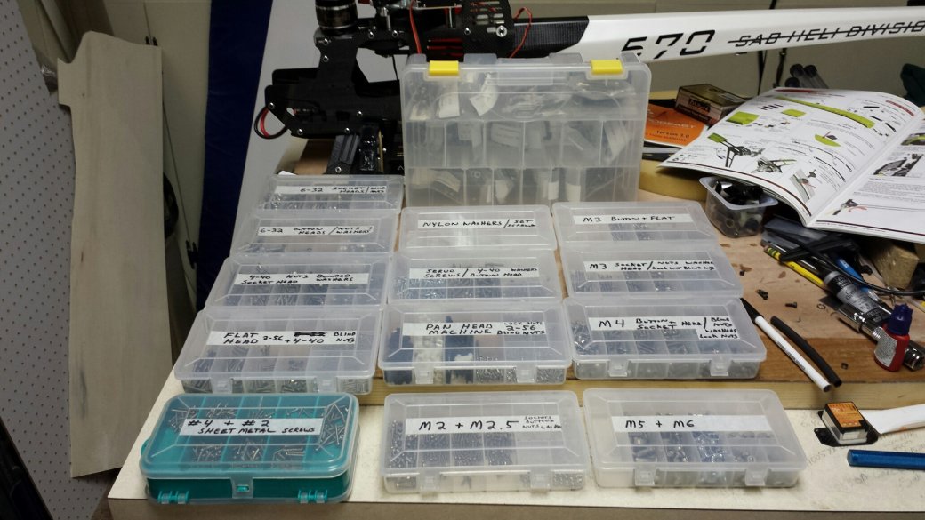 I started the night wanting to put some snake skin on the wiring on my Goblin heli. That lasted just long enough to find out that I didn't have enough of the right size heat shrink to do more than two servo leads. S0 I went through all my screws and nuts and such to put in an order with Trimcraft Aviation RC. It never ceases to amaze me how you can have boxes and boxes of screws and not have the right ones.