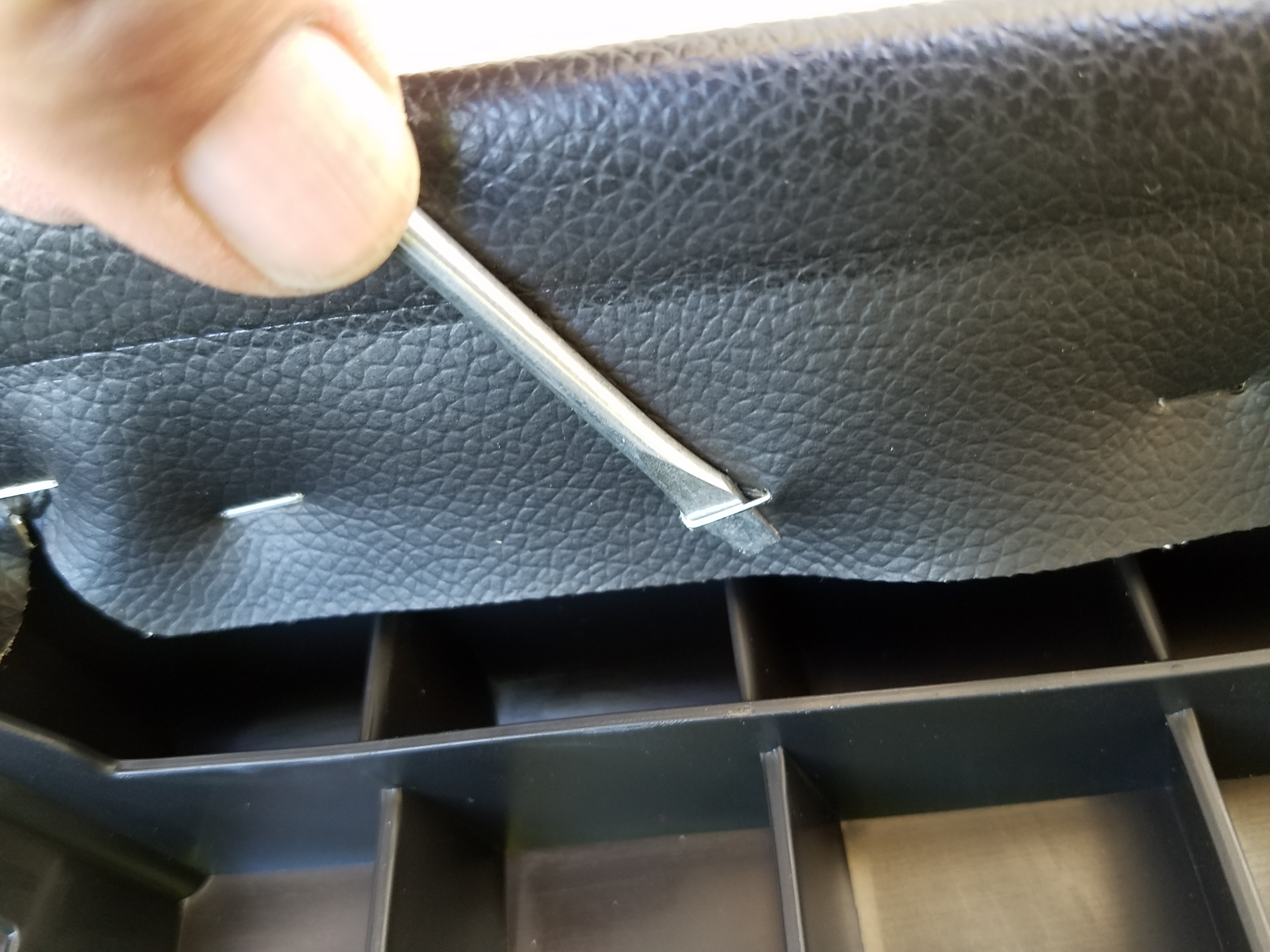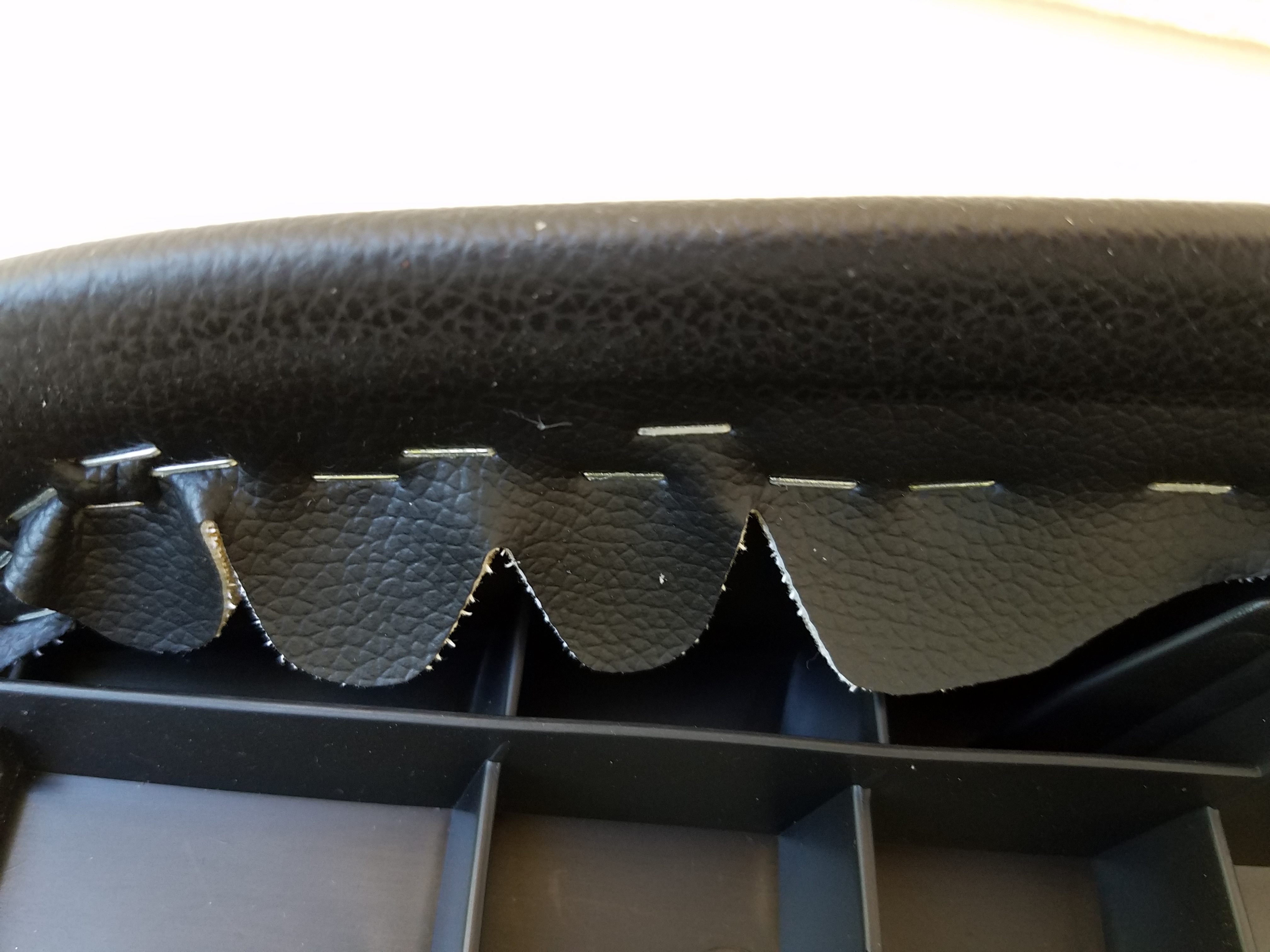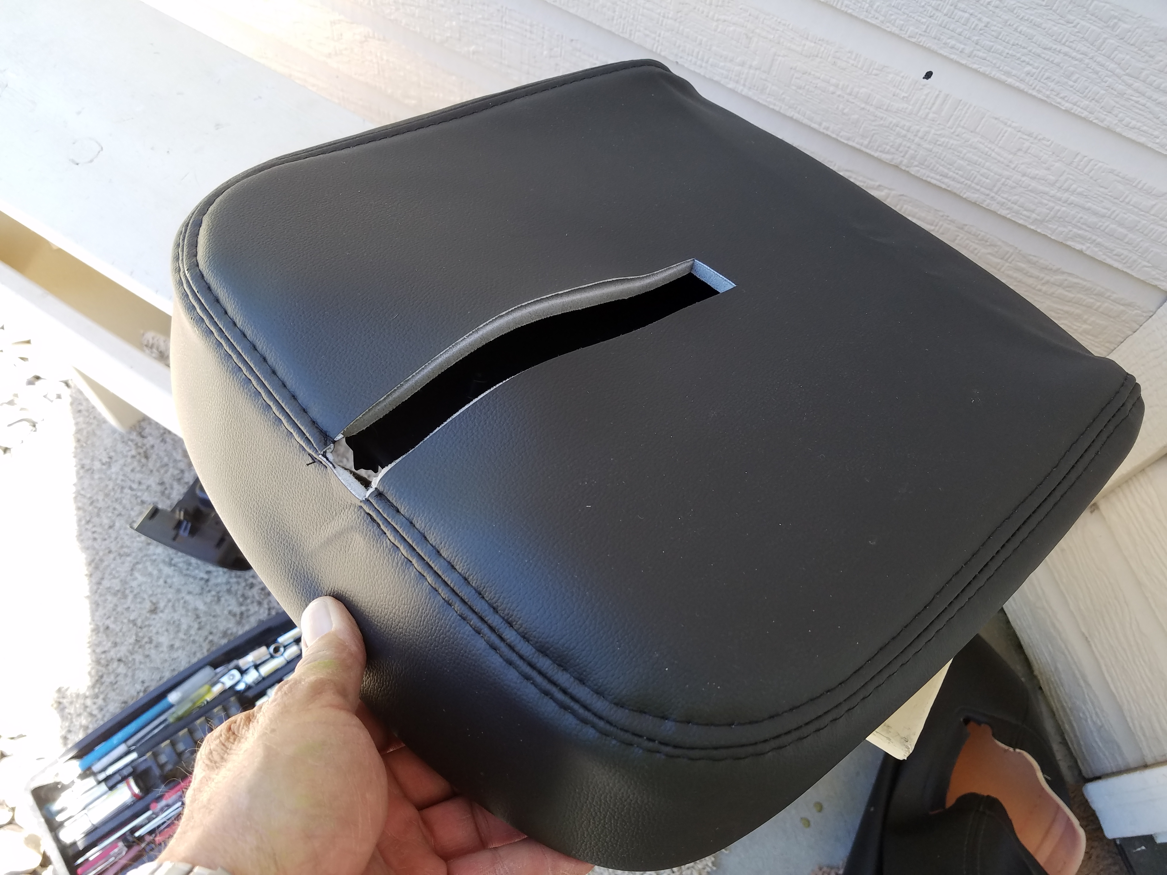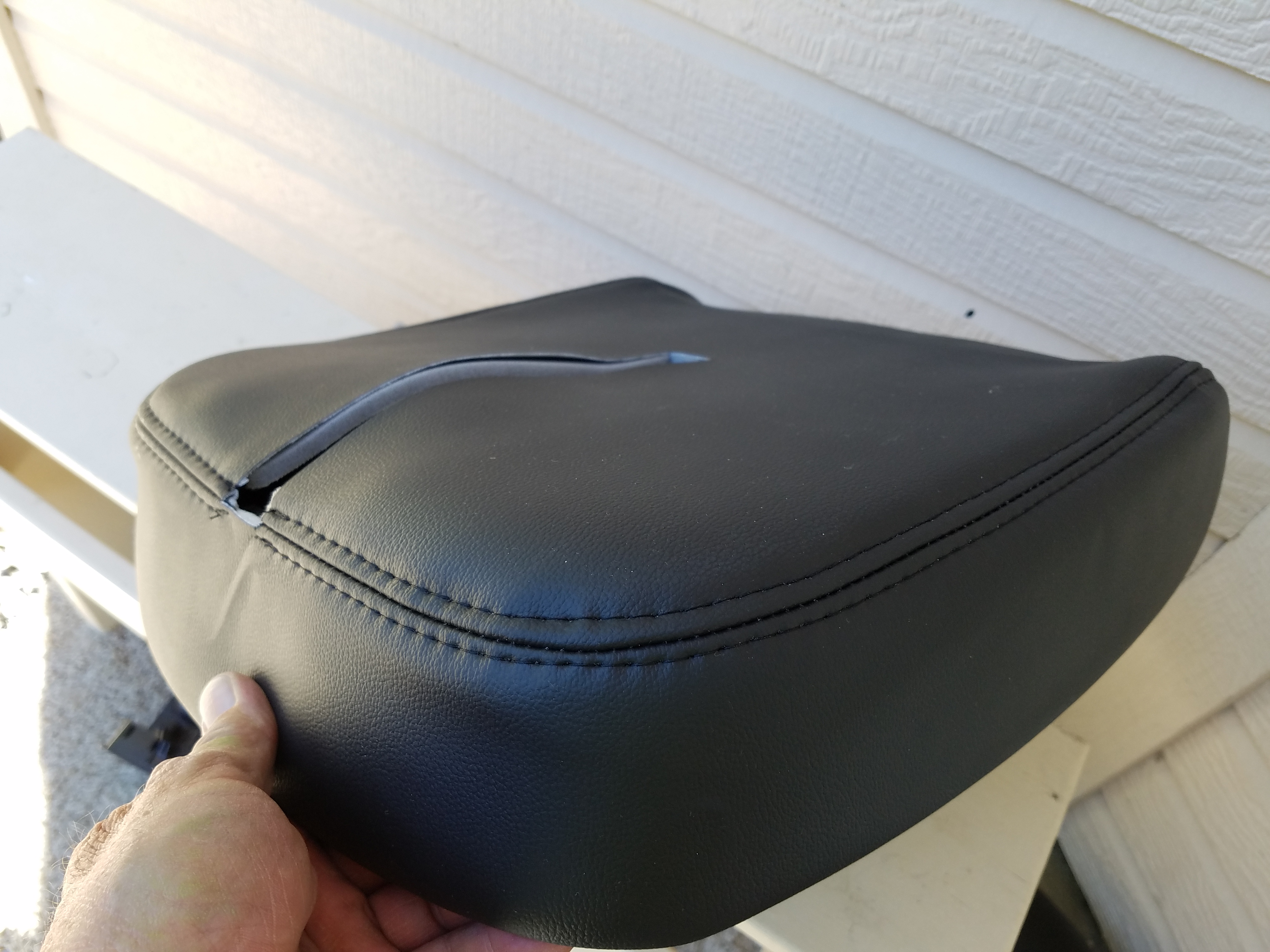 See? I can cover auto upholstery too. Lol. Tonight I'm going to do the console lid and hopefully find time this weekend to do my driver's side seat. It's really not a difficult task. Remove lid, remove old staples. Then remove worn console lid cover. Reverse the process to install.