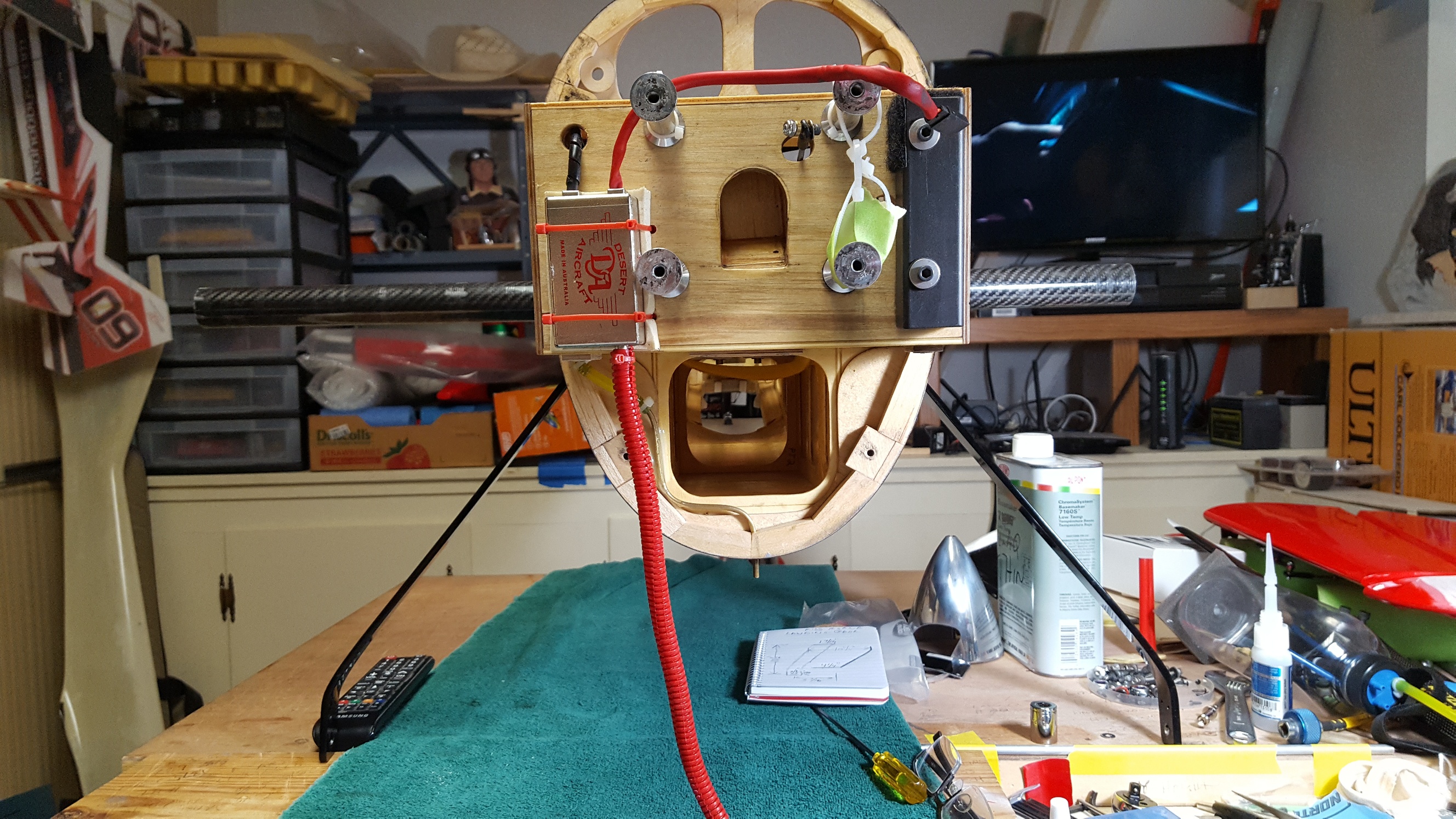 The last time I flew Miss Moana I tweaked the gear a bit, so I pulled it off today to straighten it out. I obviously designed it to look good, not to be easy to work on. To get to the inner bolt on each leg you have to remove the tuned pipe. That means the engine has to come out.
