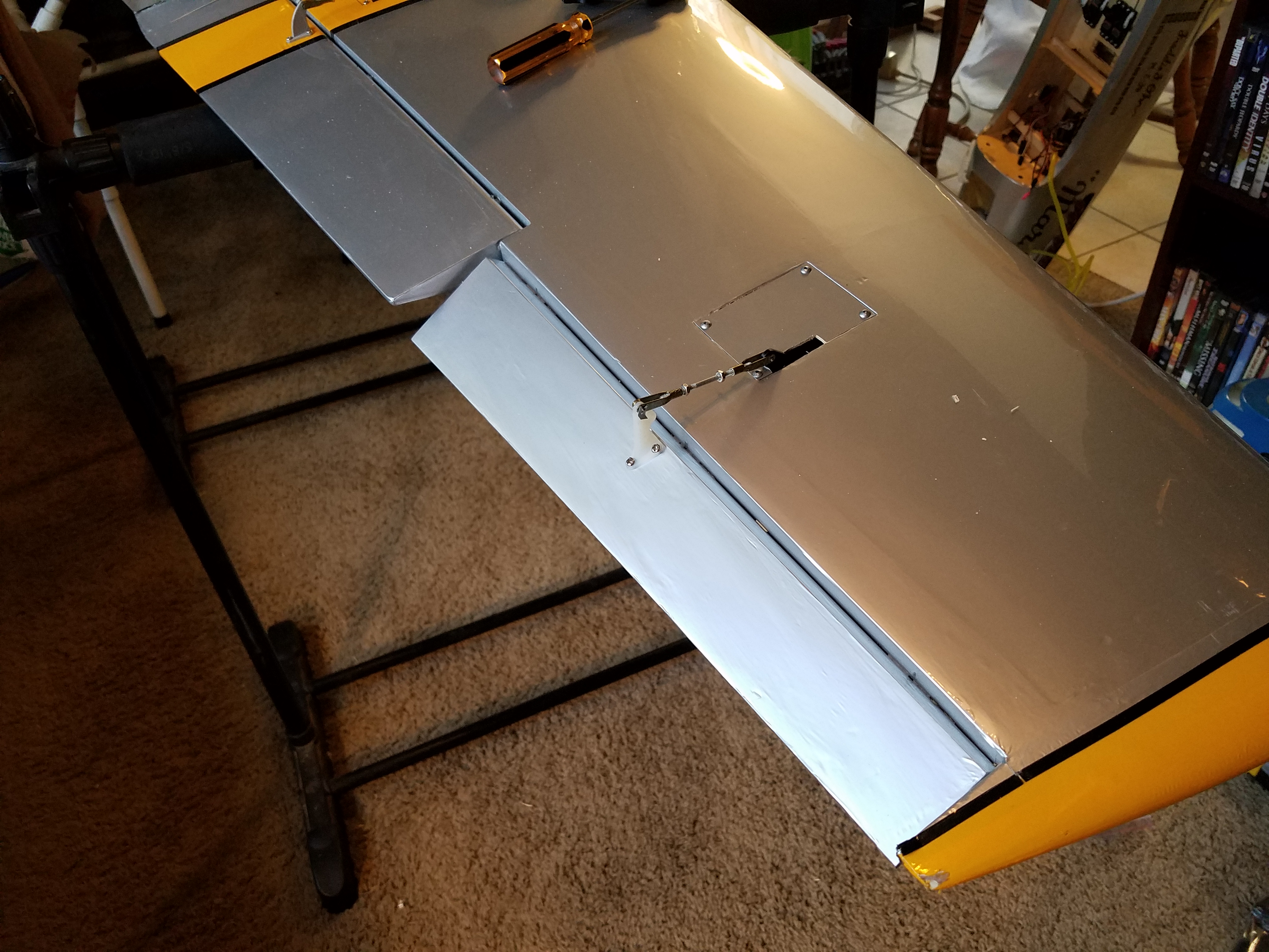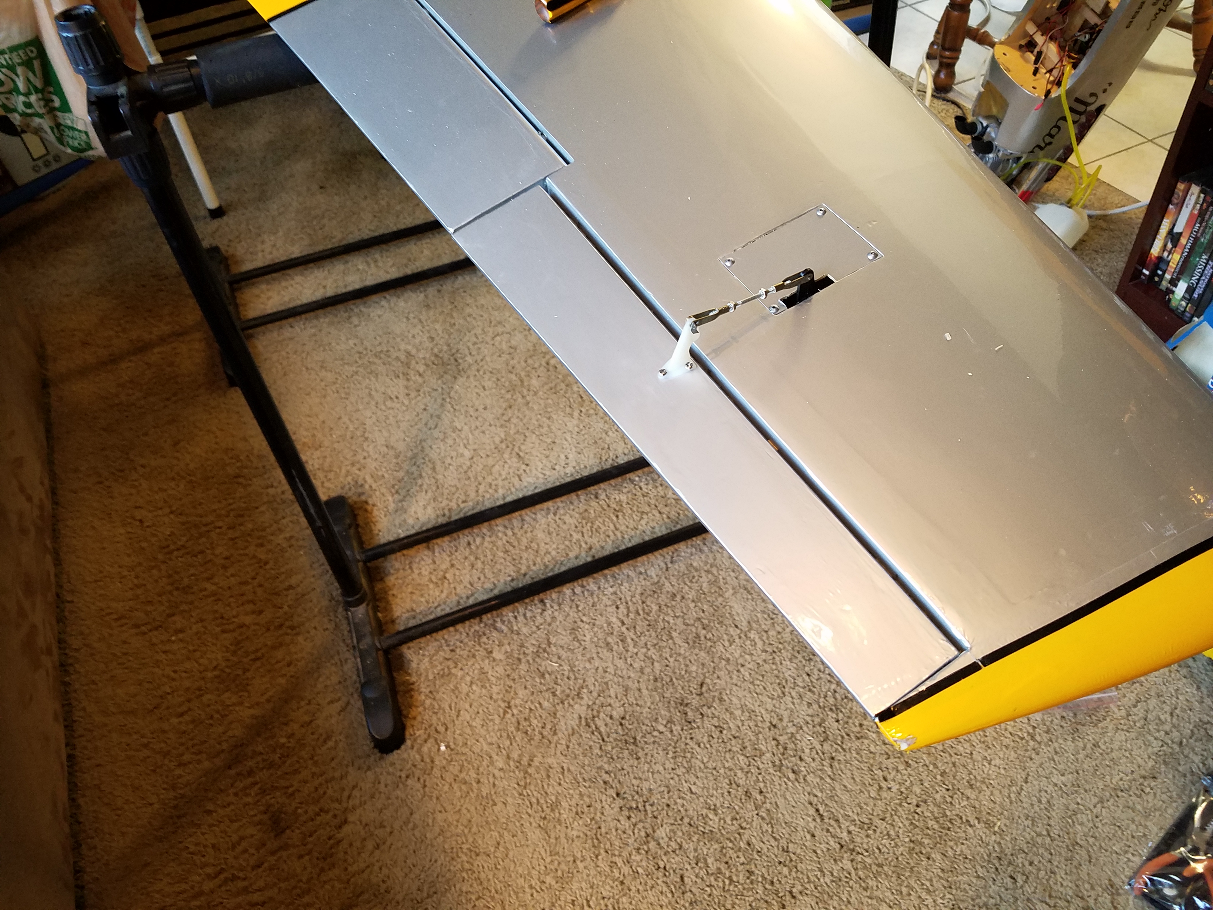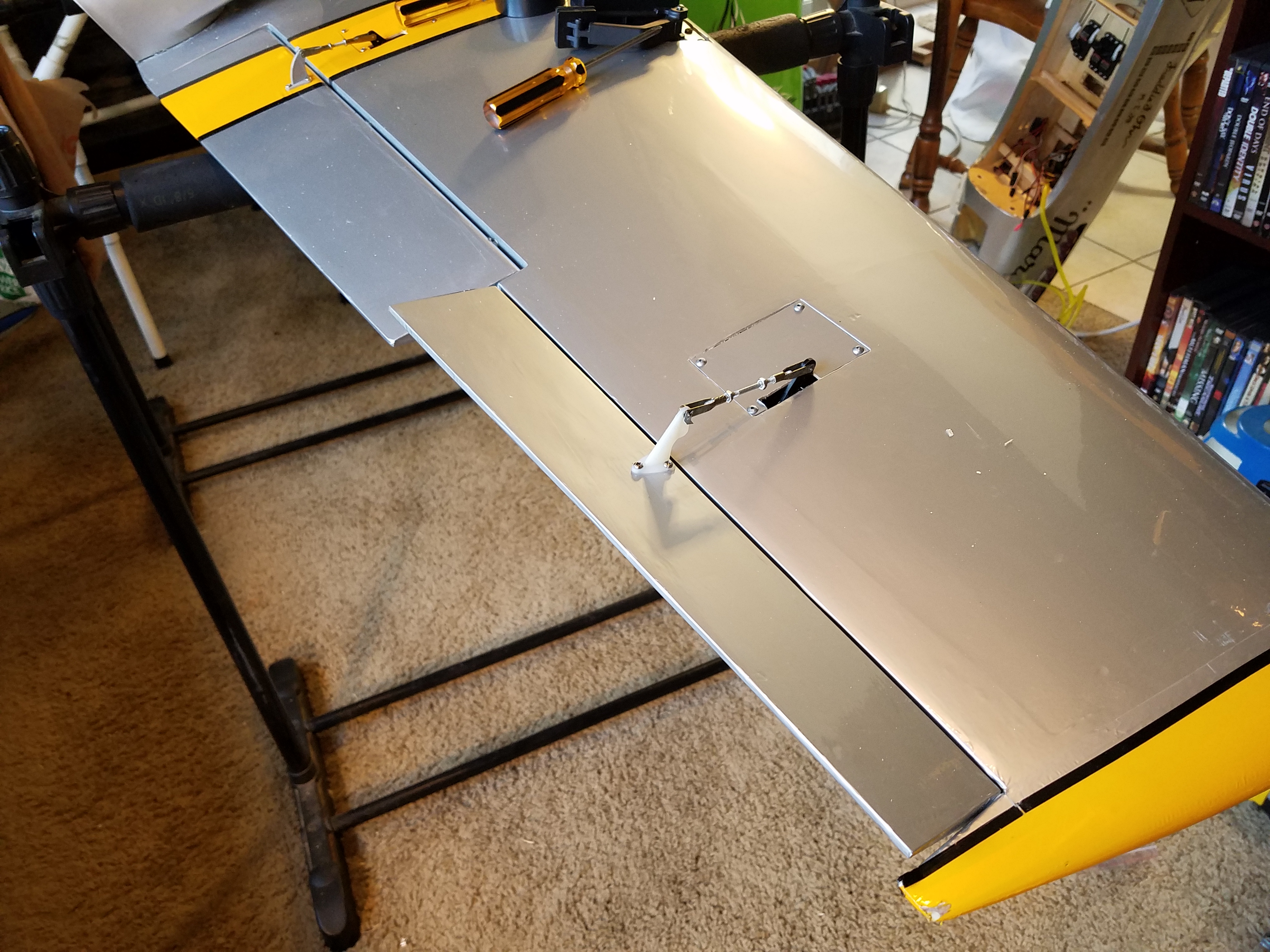 So I now have the flaps reconnect, set up and dialed in. I had to go back in to my radio and reprogram the channels. I had forgotten the flap servos will need to rotate opposite of each other for proper flap deployment. I guess I'll have to go back and reprogram the elevator channels. They too, like the flaps and ailerons need to rotate opposite of each other. Guess I'll have to piggyback the rudder and power ports on the receiver. This is the primary reason I bought the new MZ32. A guy runs out of channels real quick on a setup like this. I know the Behemoth DS will be no different. Thankfully I will be using much better quality programmable digital servos on that one. So channel count won't be quite as crucial. The HS645MG's are good strong servos. Just a little noisy and not all that precise. But they will work just fine for this application. I slowed the servo speed down to 4.0 up and down on the flaps so they don't just "pop" down. I may have to do a fine tune of more or less speed. But that can wait. I also set take off and approach flap yo about 20 degrees. And full landing flap is at about 50. I may have to change those after I consult the manual for proper deployment angle. But again, it's good enough for now.