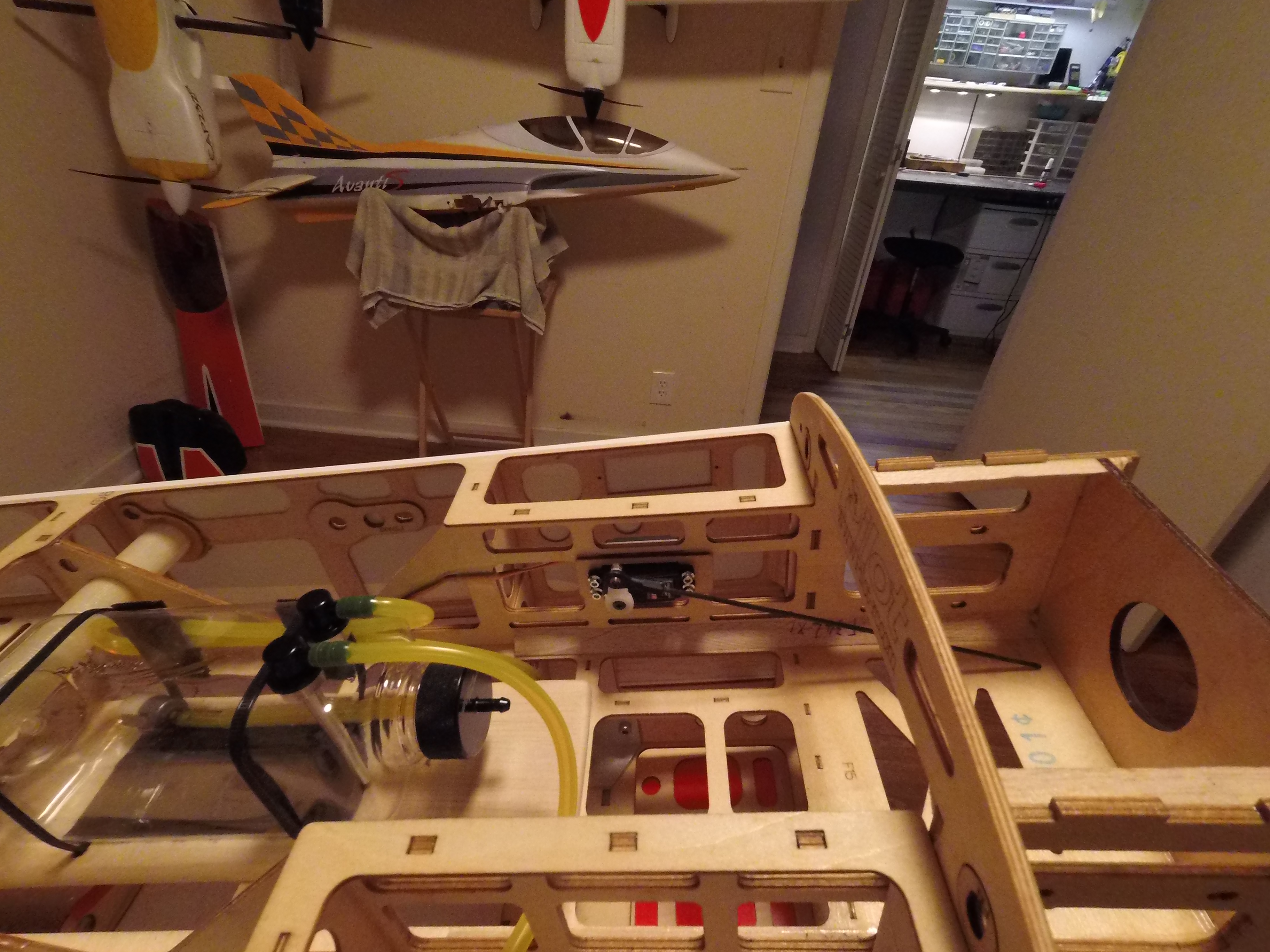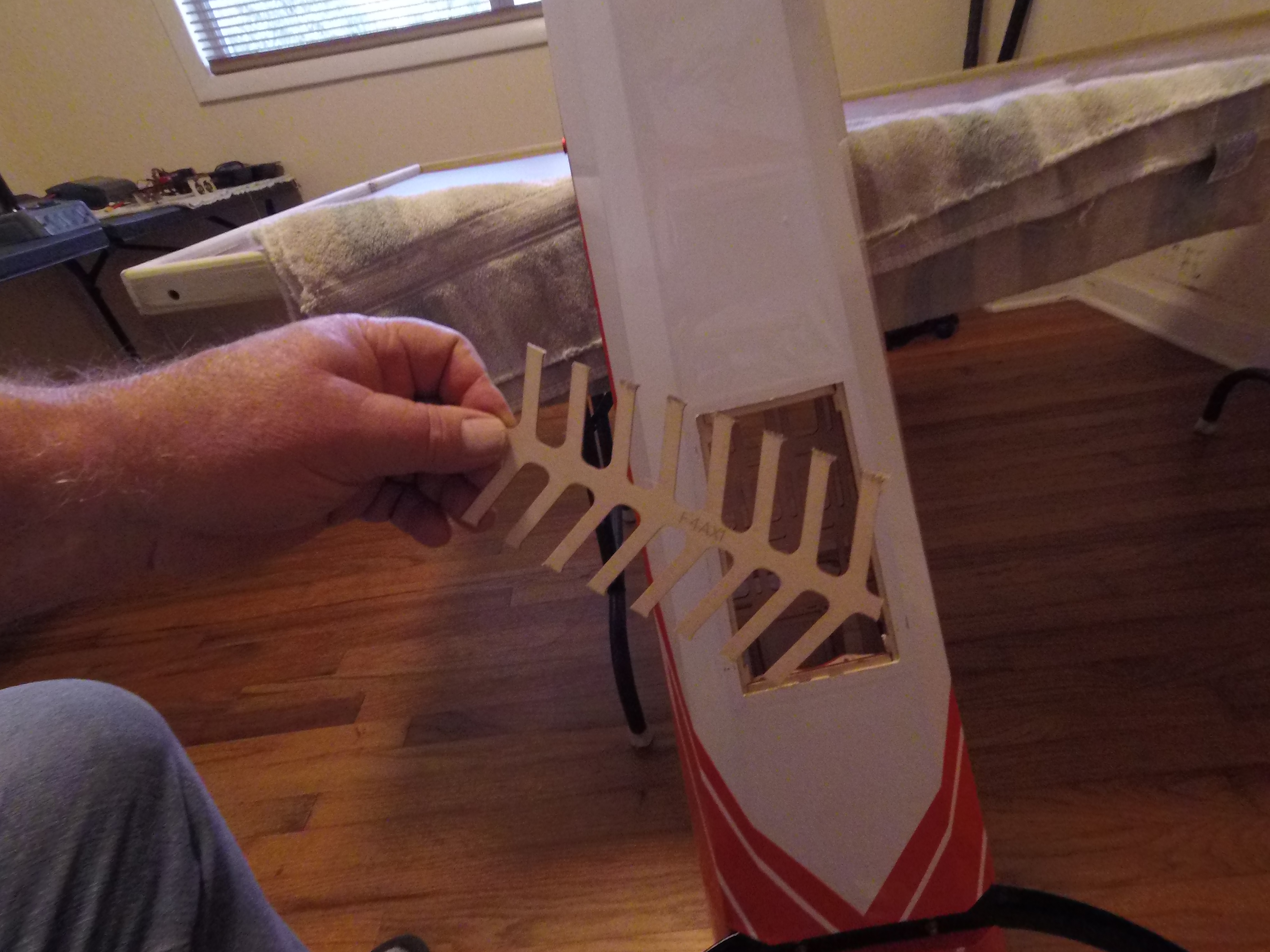 It’s coming along nicely. That is going to one nice plane with low maintenance. I agree with tail wheel if you like me not all my landings are perfect and have the tail wheel hit the rudder is not a good idea it is hard on the hinges and painful to replace.Well snoop's I have been busy cutting parts by hand to facilitate throttle servo, canister, fuel dot installation and fuse bottom access cover. I will get busy making a tail wheel shim too. You put a "Bug in my ear" and boy now it's really "bugging" me. lol