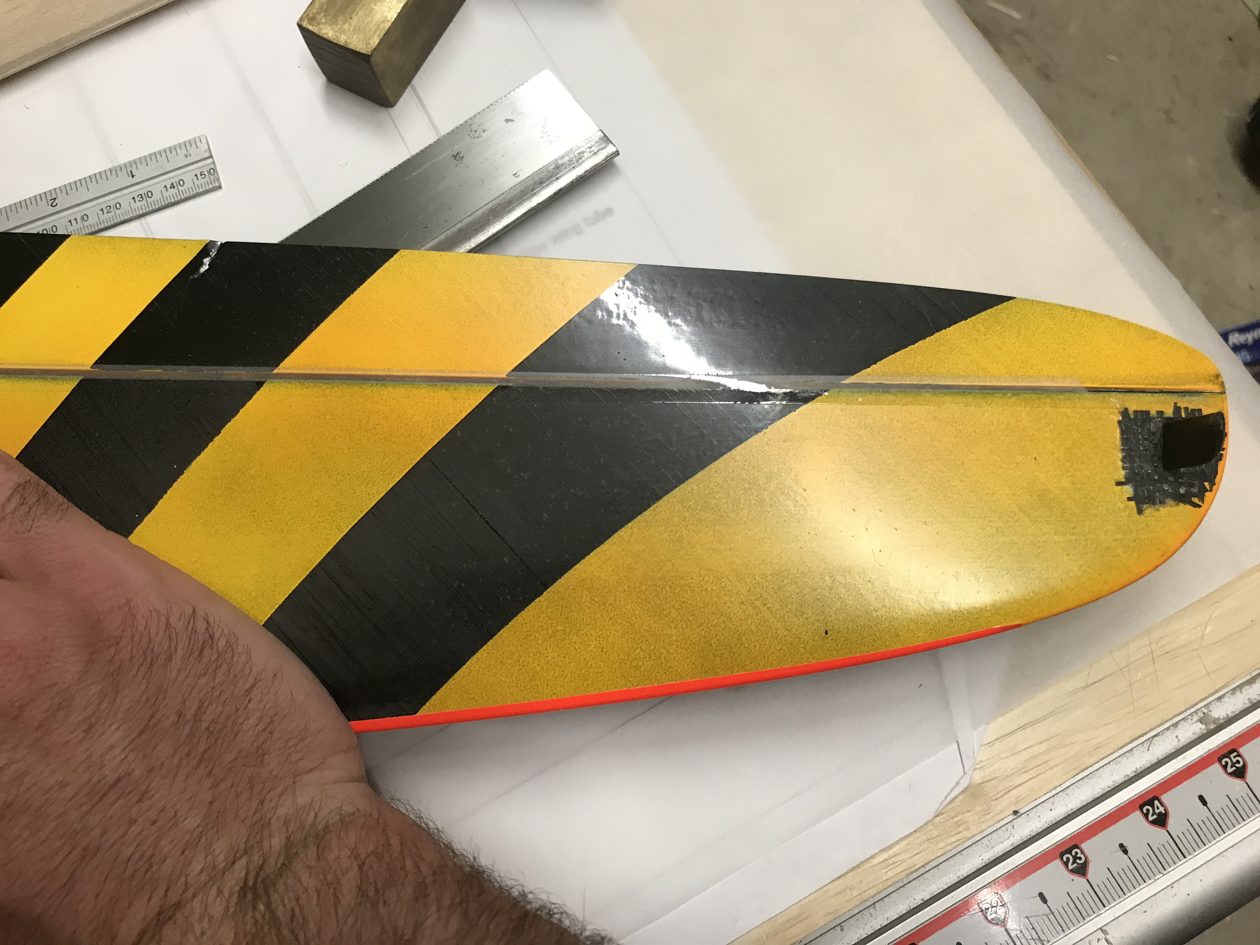 Had to do a little repair on my dlg after a dumbass moment yesterday. Buddy offered me to fly his brand new BAMF dlg. Third flight I was ending up a little short on landing and totally missed that my dlg was in the way. Caught the te of the aileron on mine with the bottom le of the vertical on his. Mine had to be repaired his will get a replacement part. Literally less than an hour flight time on his new bird and I go a F it up. Felt so horrible.