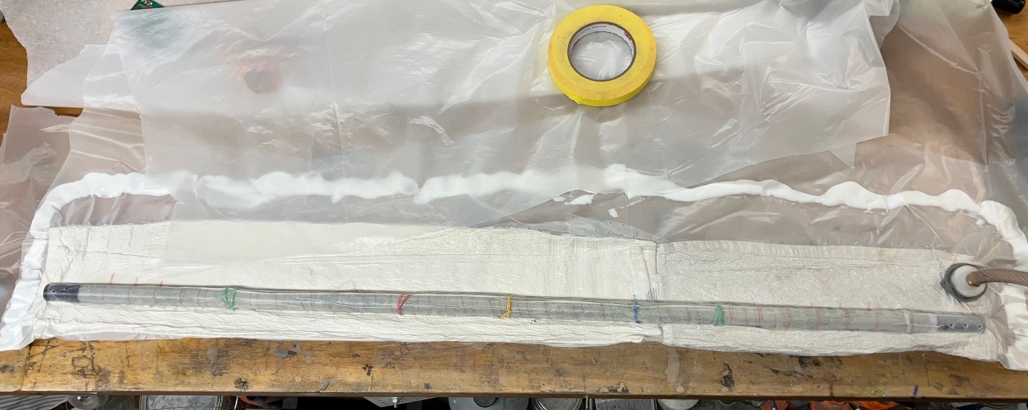 The carbon fiber tube was treated with a coat of Vaseline then one wrap of parchment paper was wrapped, this was smoothed into the Vaseline with my finger as it was wrapped around. Two wraps of 4 ounce cloth were wet out and wrapped around the tube, this was followed with peel ply and perforated release film, then place in a vacuum bug under full vacuum. I used rubber bands to keep the peel ply wrapped around the tube, that is the various colored lines in the second photo.